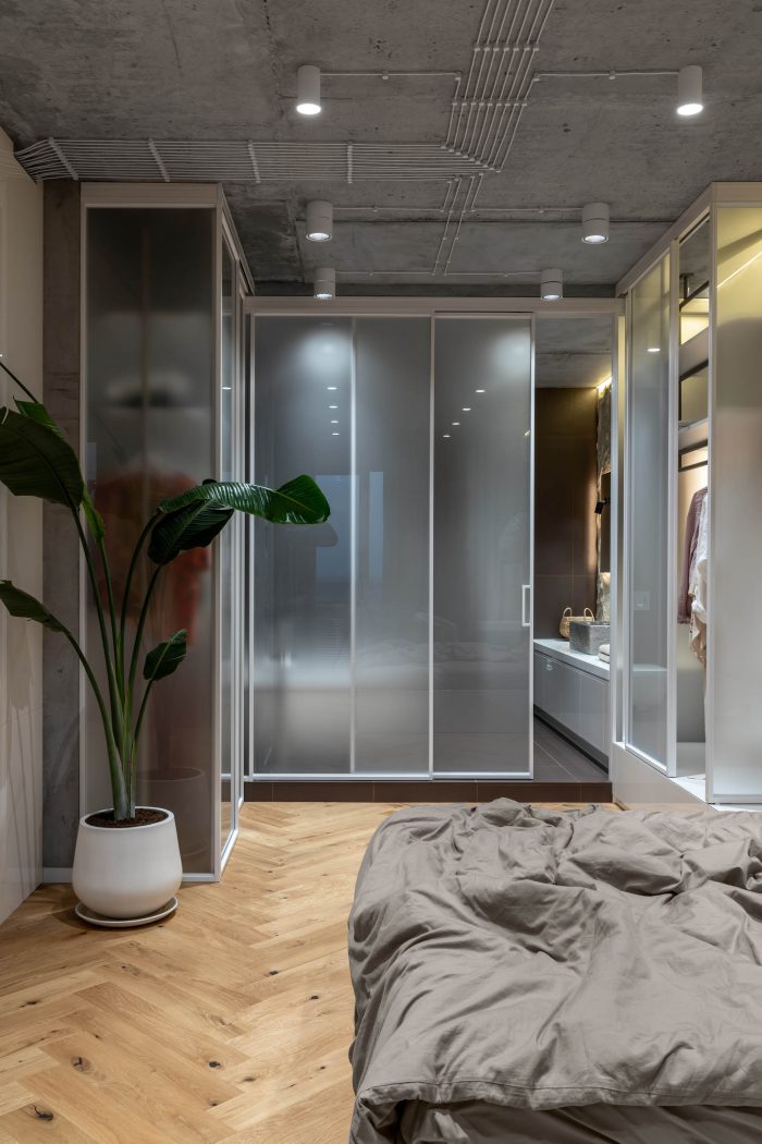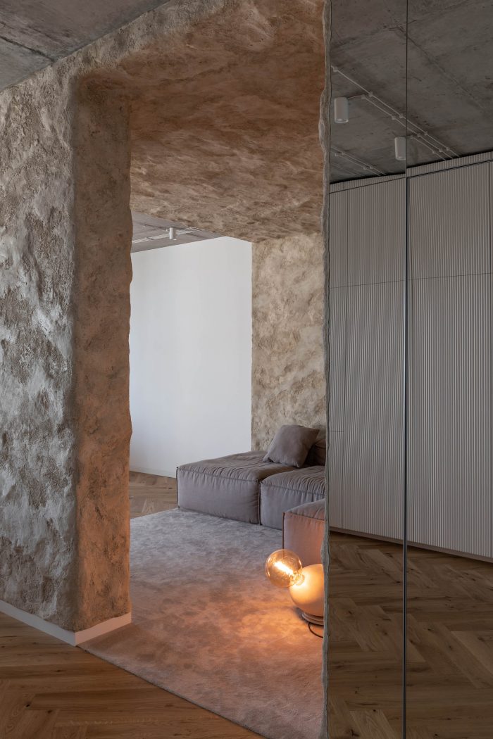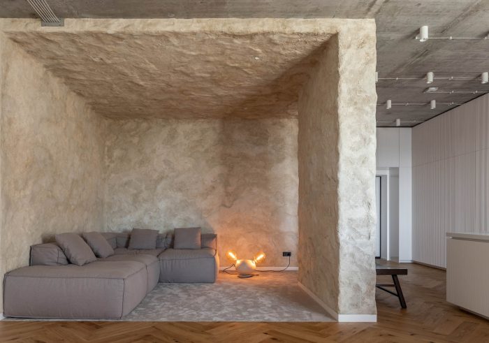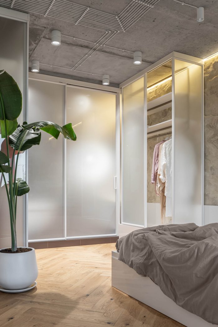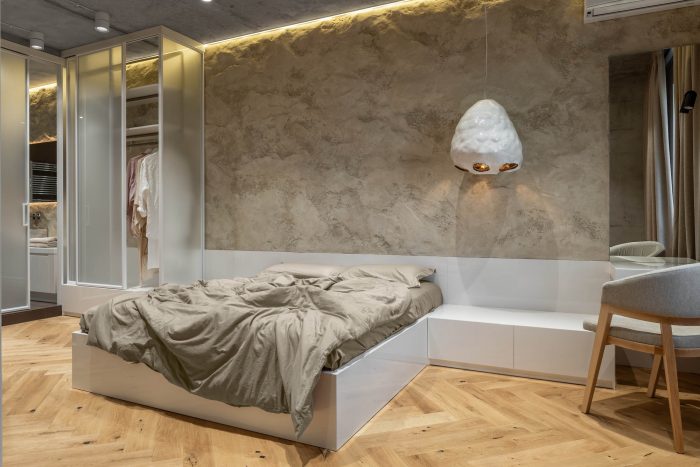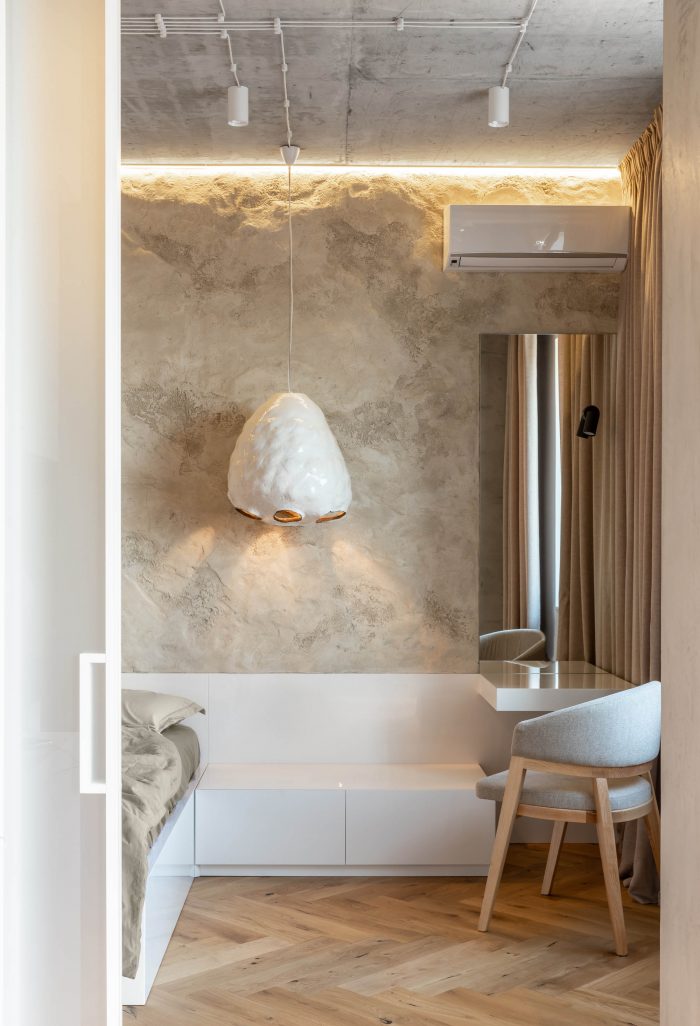 This craft was also popular in our culture, but now it took us several months to find a master who can create a work of such complexity. Above the kitchen island, there is a set of four jug lamps that were specifically created for this apartment. In the bedroom, there is a ceramic Makiivka lamp from the Inside. Out collection that topped the trendsetter list by ArchDaily at iSaloni 2019. The bedroom space is also open and connected to the bathroom. They are partitioned by translucent doors. The colors and textures of the living room endure in the sleeping area but perform differently. "I am in high spirits. My guests are especially fascinated by the clay "cave" as something unusual and impressive. As for me, it feels here like somewhere in the middle of wild untouched nature. I believe that the Ukrainian contemporary style will conquer even more hearts", says Anastasia, the owner of the apartment.
