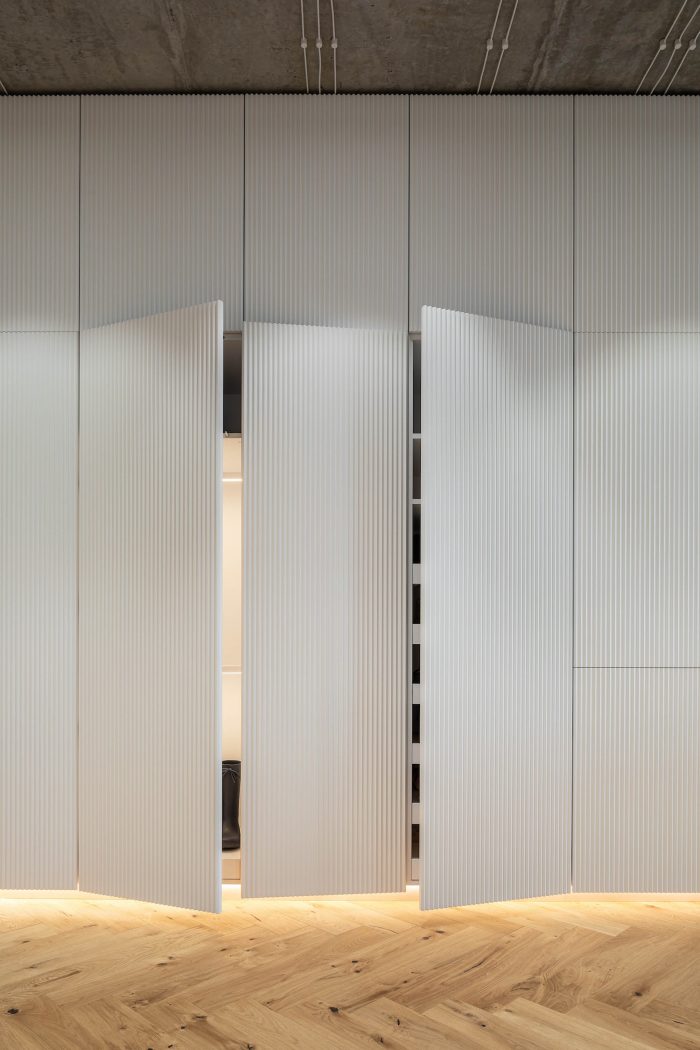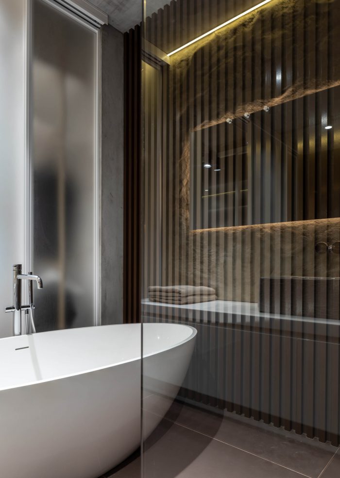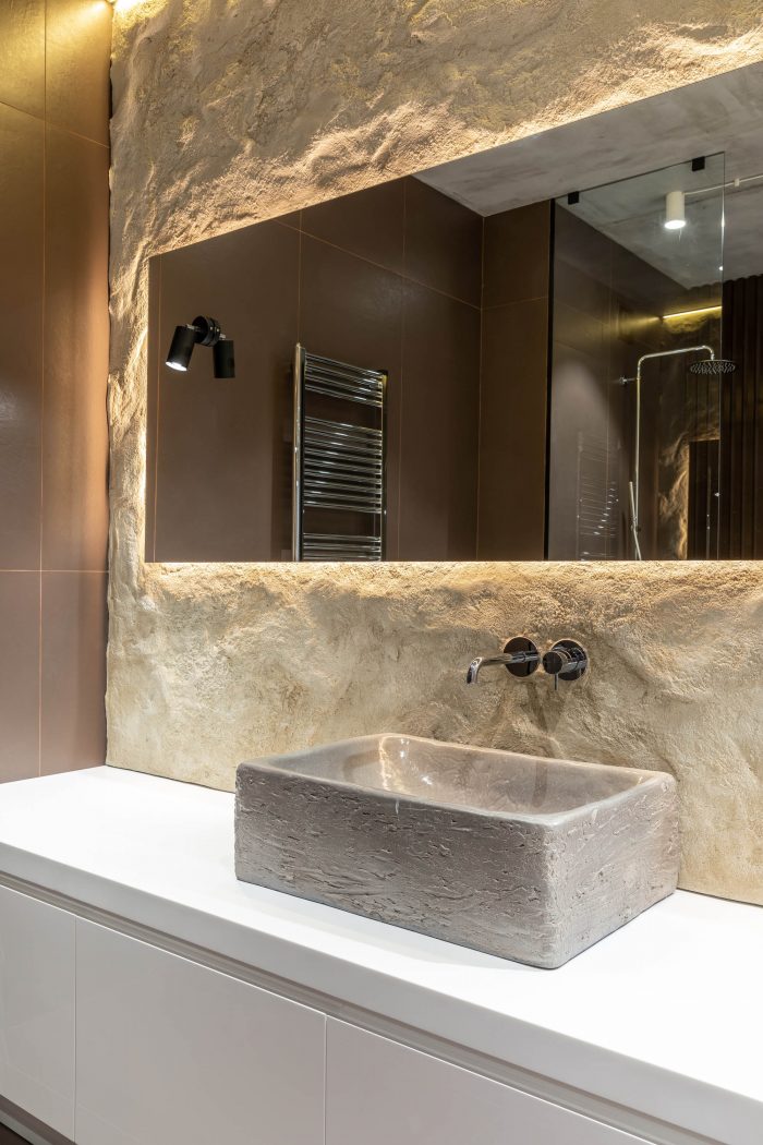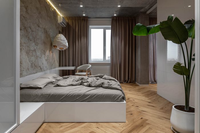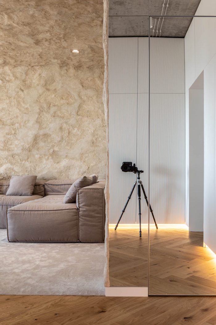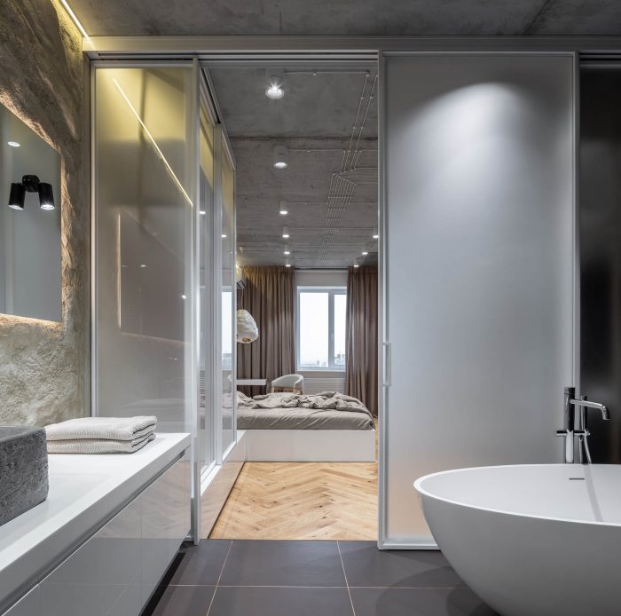 This craft was also popular in our culture, but now it took us several months to find a master who can create a work of such complexity. Above the kitchen island, there is a set of four jug lamps that were specifically created for this apartment. In the bedroom, there is a ceramic Makiivka lamp from the Inside. Out collection that topped the trendsetter list by ArchDaily at iSaloni 2019. The bedroom space is also open and connected to the bathroom. They are partitioned by translucent doors. The colors and textures of the living room endure in the sleeping area but perform differently. "I am in high spirits. My guests are especially fascinated by the clay "cave" as something unusual and impressive. As for me, it feels here like somewhere in the middle of wild untouched nature. I believe that the Ukrainian contemporary style will conquer even more hearts", says Anastasia, the owner of the apartment.