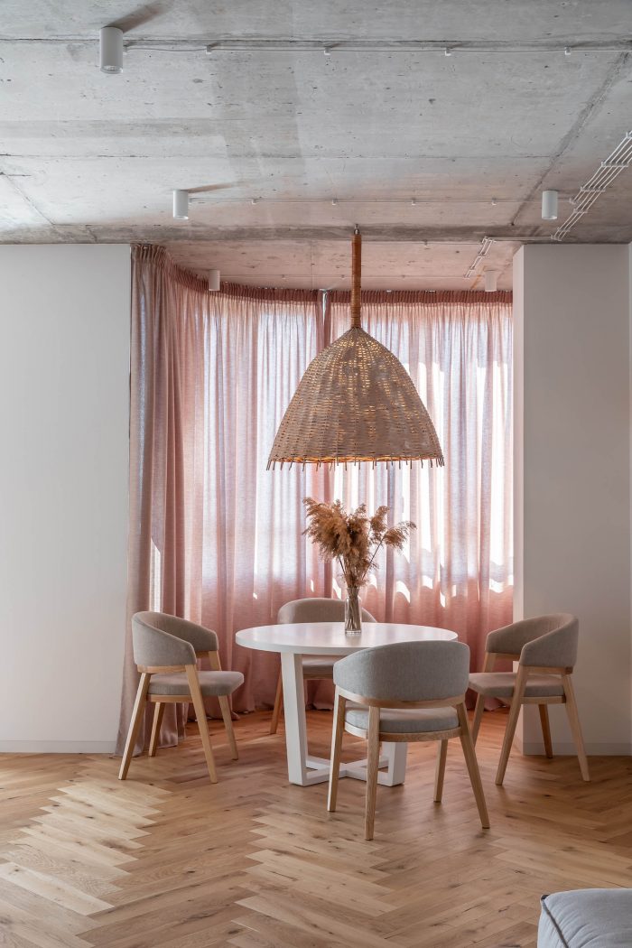 The living area is almost an art object. The cube is decorated with plaster repeating the surface of ancient clay huts. The walls are covered with a special clay solution to get the desired volume. The relief was created by the element itself: when drying, the material had cracked and formed unique patterns. Here, the main beholder of such a force of nature is the Ochi lamp created by Makhno. In general, all the lighting in the apartment, except for the technical one, was created by Makhno Studio. Above the dining area, there is a handmade vine lamp.
