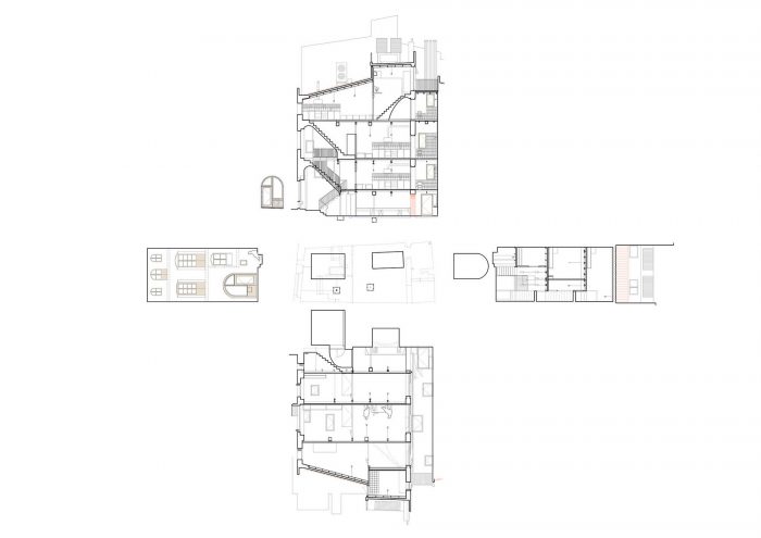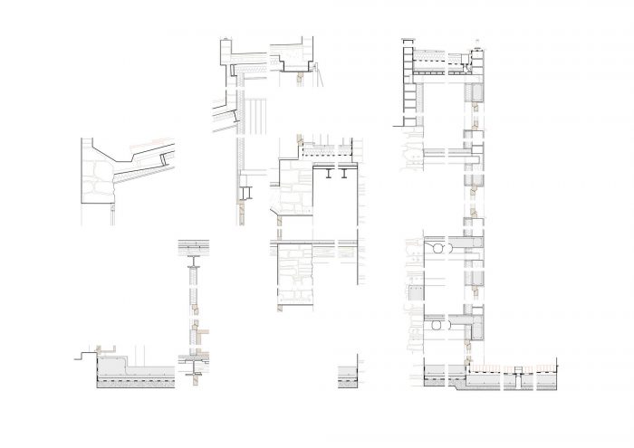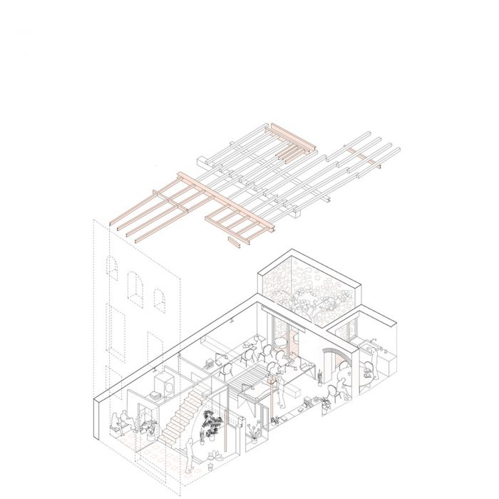 The existing structure is reinforced and the walls are consolidated. Colors that are used in the new structural elements were discovered in the existing walls.