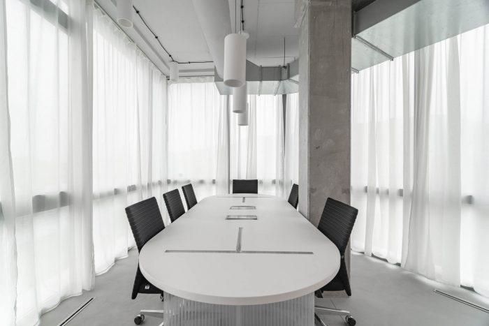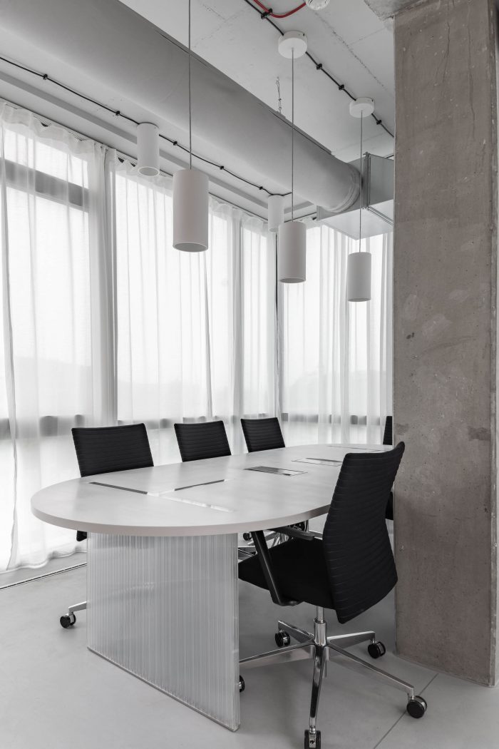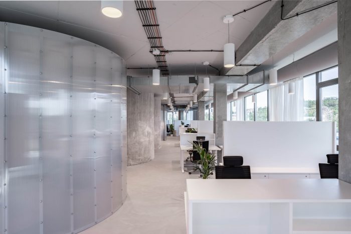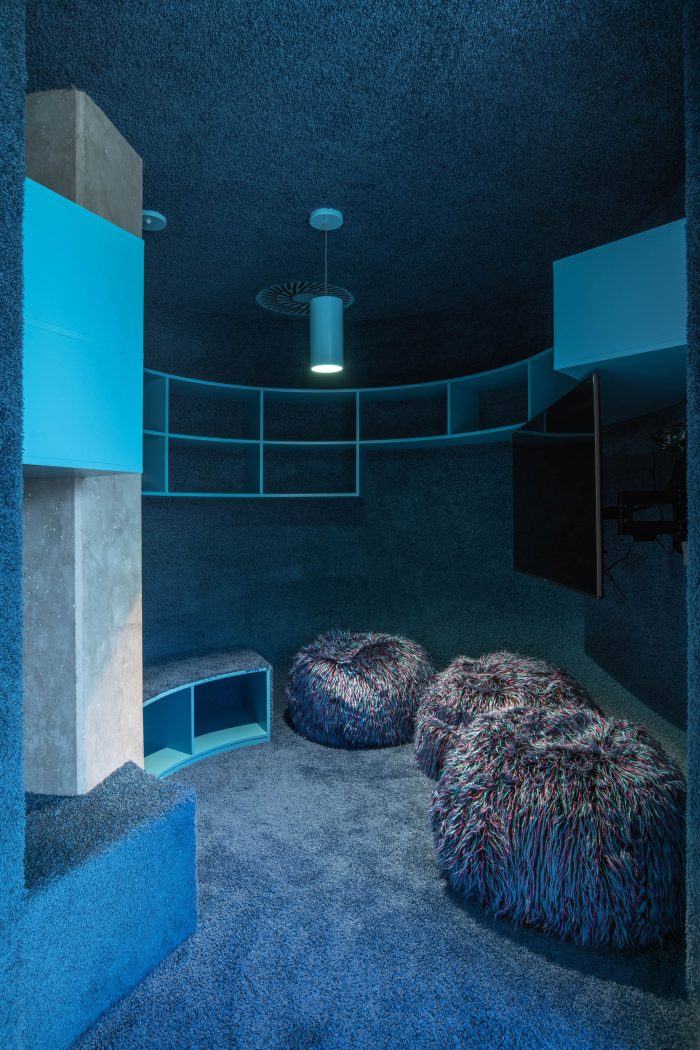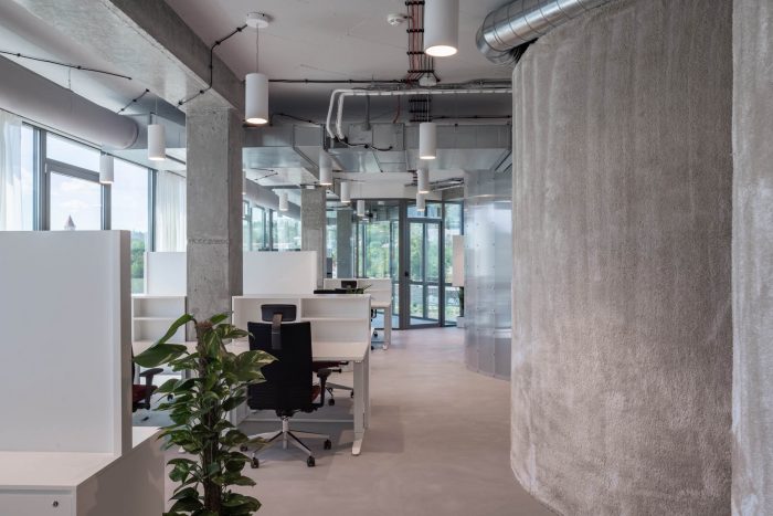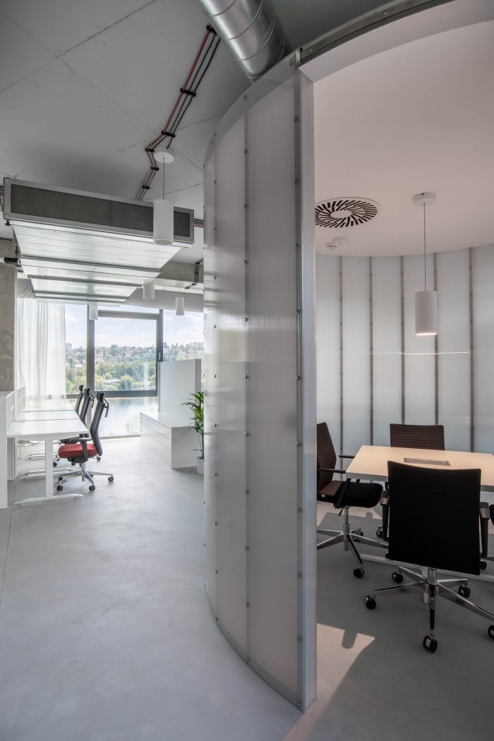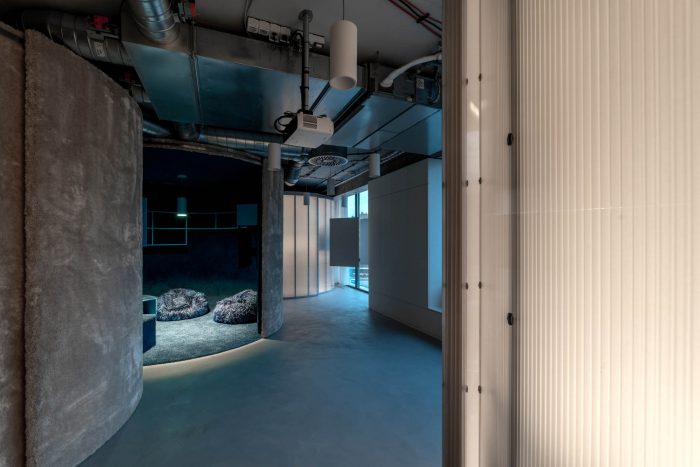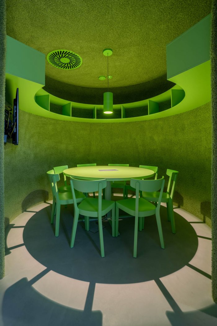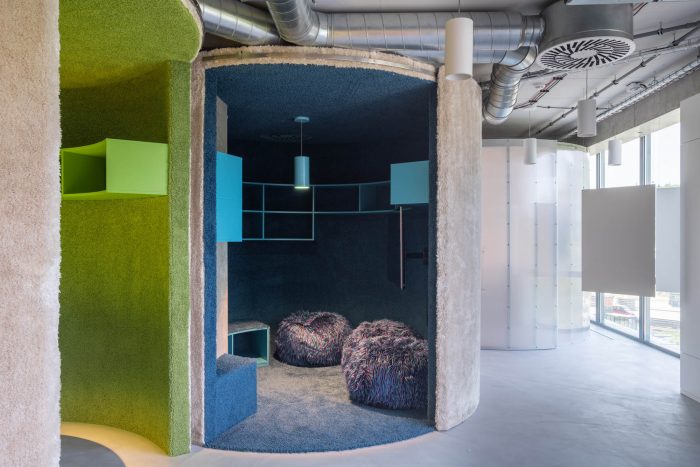 The brainstorming and relaxation rooms along with the dining area lie at the heart of the entire office, where the fundamental and valuable activities of the company can take place. On that account, the sides of the materials were conceived in a different way by lining inside and outside with a tactile high-pile carpet to provide comfort. Other volumes are translucent polycarbonate, wood, plasterboard, or glass. Last but not least, the Melown Technologies SE logo was also a source of inspiration, its rounded typography can evoke the designed volumes in the industrial office space.