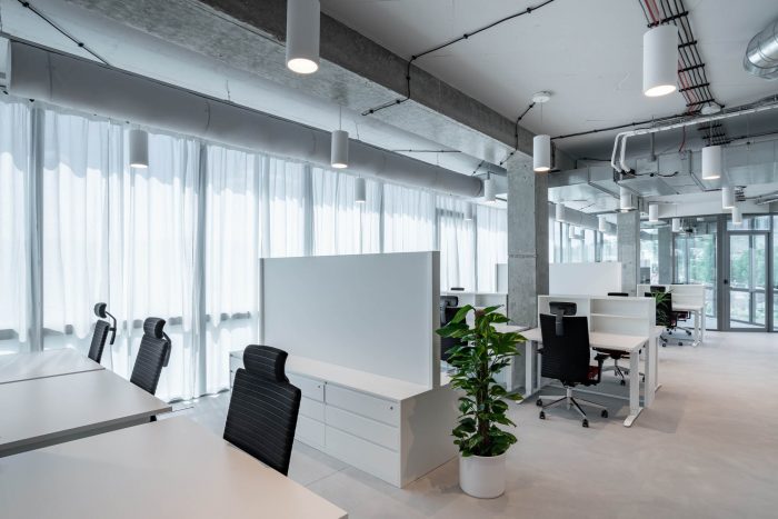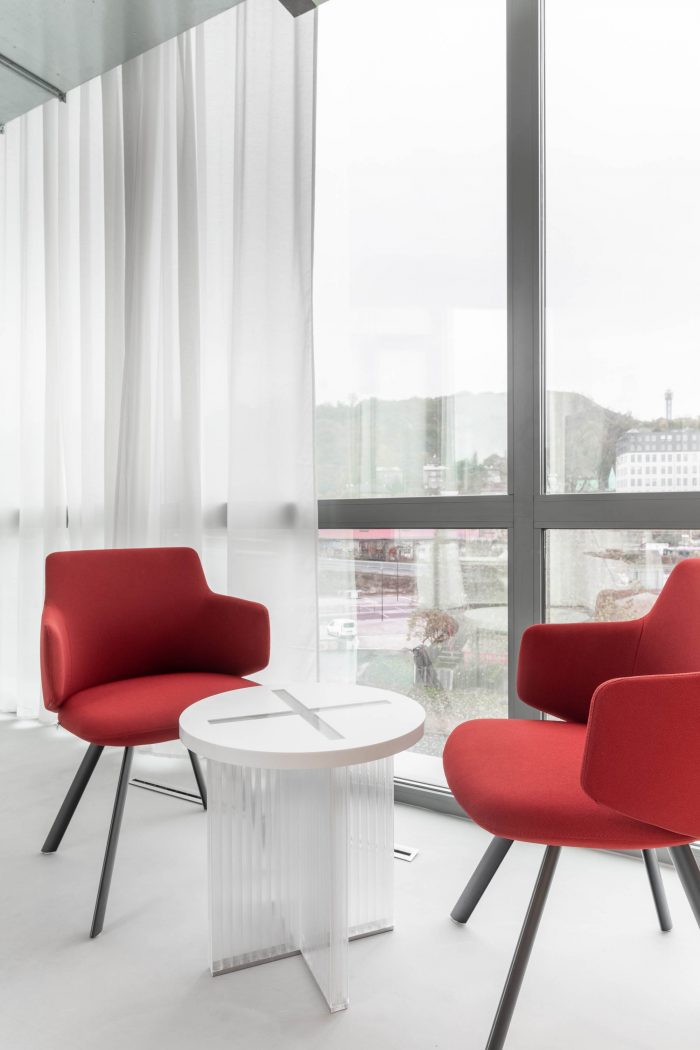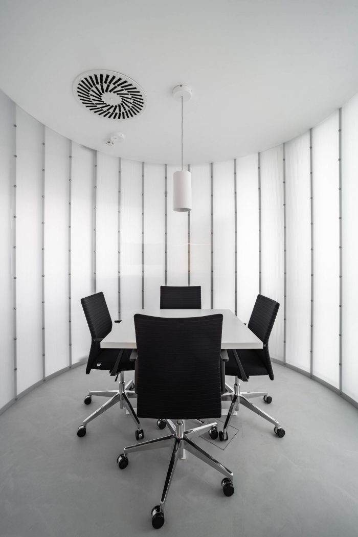 The overall interior design consists in maintaining the existing principle of an open office, the so-called open-space, as well as in adding new material and spatially defined functional spaces. These cylindrical volumes are located in contrast to the workstations in the middle of the layout and partly around the perimeter.