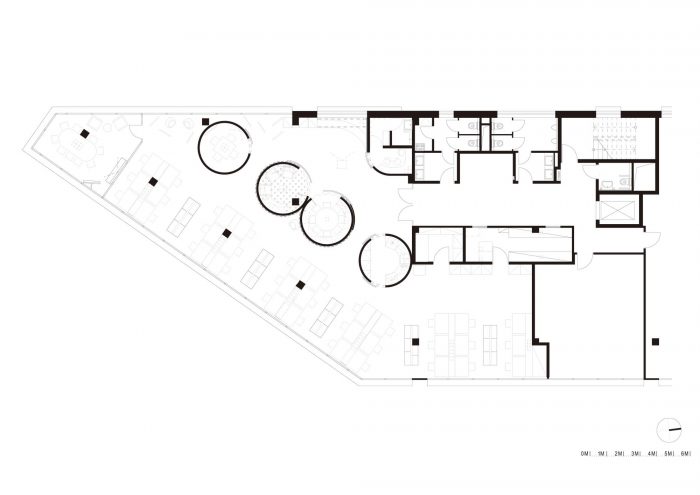 整体的室内设计包括保持现有的开放式办公室的原则,即所谓的开放空间,以及增加新的材料和空间上的功能空间。这些圆柱形的体量与布局中间的工作站形成对比,部分位于周边。