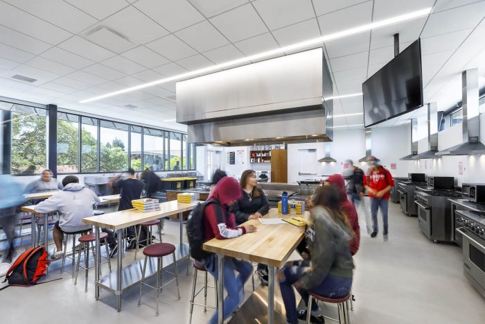 The experience of arrival to the new building brings you through, under, but also up and into the tree canopy. The first floor houses two environmental science labs and a maker space, and a laboratory for robotics and other design-and-build projects, which fall under the umbrella of career technical education (CTE). The laboratory has an operable window wall that can be opened to allow the flow of fresh air and connect the rooms to the courtyard. The second floor houses two physics labs and a culinary arts lab.