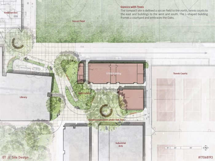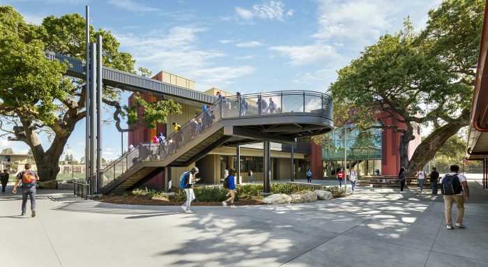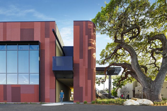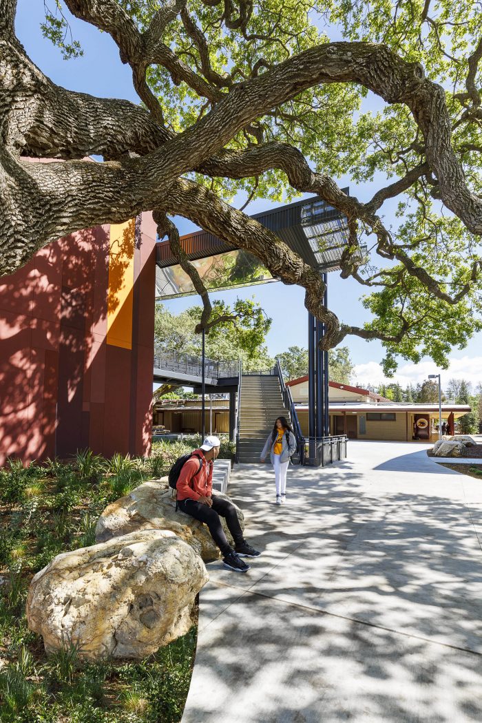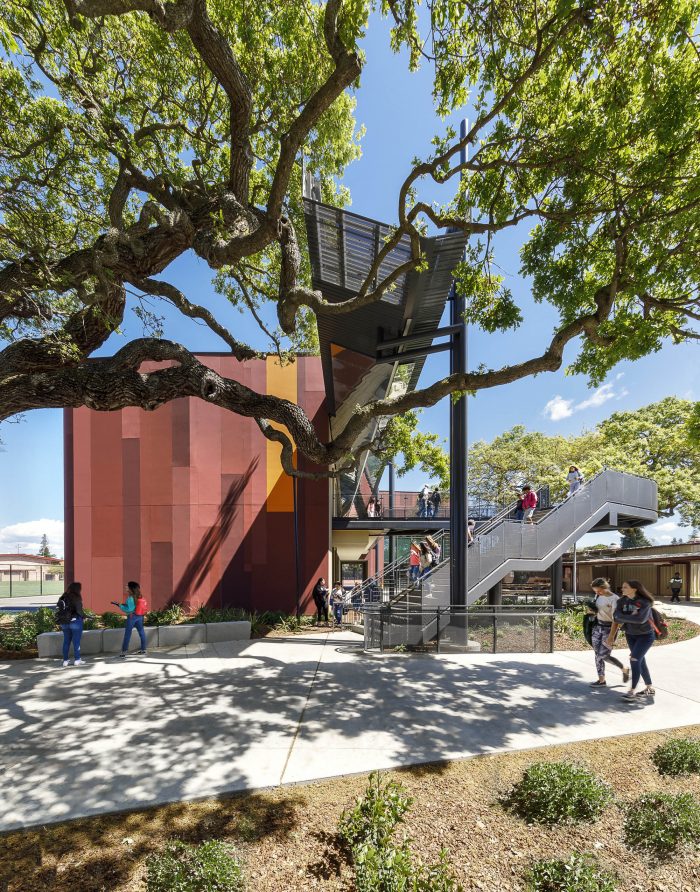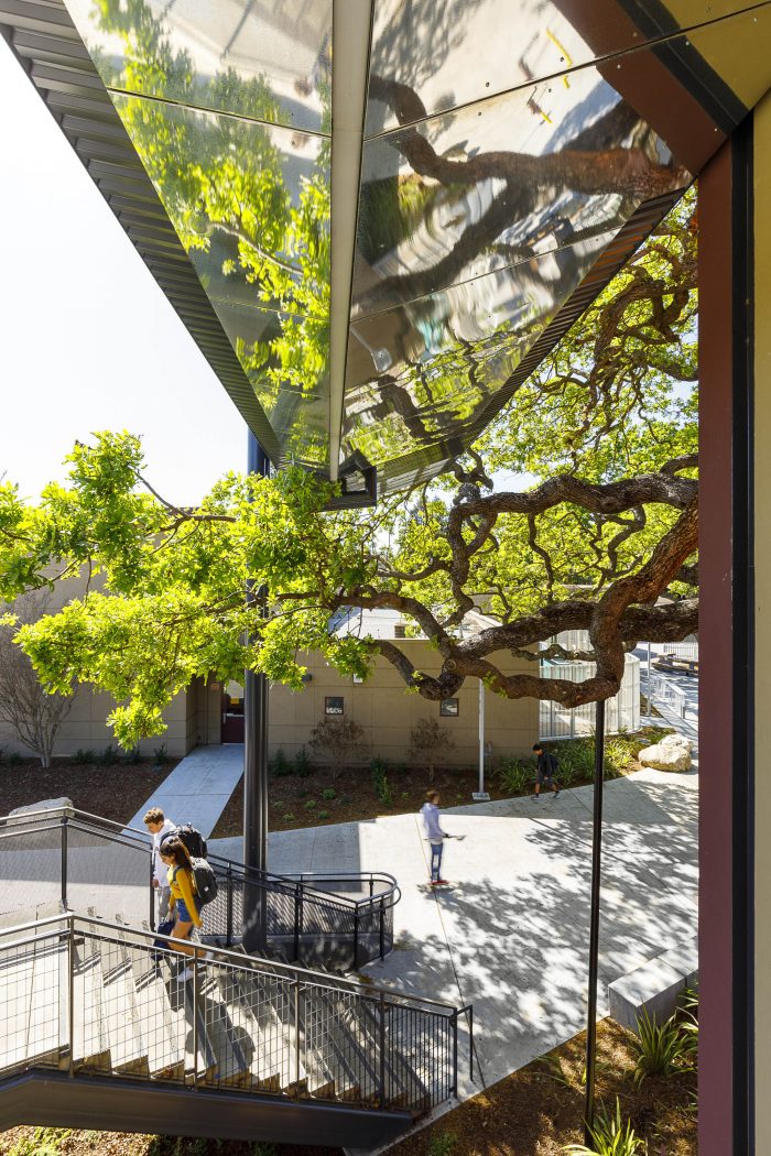 The design of the STEM building for Menlo-Atherton High School, located in a suburban community between San Francisco and San Jose, embraces sustainable design through a “dialog” with the existing heritage Valley Oak trees on the site. The mature trees dot the grounds of the campus, including two situated right where the school’s master plan called for the facility.