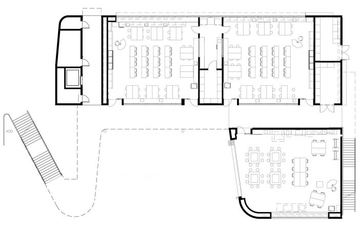 抵达新建筑的体验使你穿过树冠,在树冠下,也在树冠上,进入树冠。一楼有两个环境科学实验室和一个创客空间,以及一个用于机器人和其他设计和建造项目的实验室,这些都属于职业技术教育(CTE)的范畴。实验室有一个可操作的窗墙,可以打开,让新鲜空气流动,并将房间与院子连接起来。二楼有两个物理实验室和一个烹饪艺术实验室。