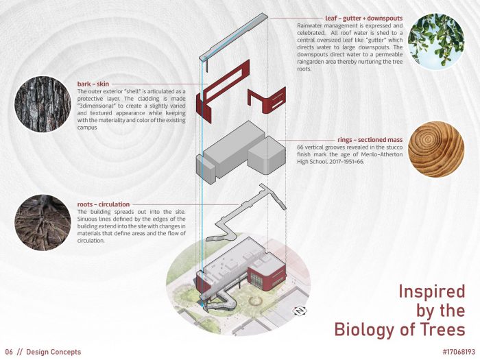The nature of leaves inspired LPA’s design for the building’s rainwater management system. Roof water flows to a central oversize gutter that, much like a folded leaf, directs water to a large downspout that spills into a permeable rain garden under the stairs. The building’s outer shell—the bark—is textured plaster. The building spreads out across the site like the roots of a tree. Sixty-six grooves are carved in the stucco finish—much like the rings of a tree trunk—marking the age of the high school in 2017 when construction began in earnest.