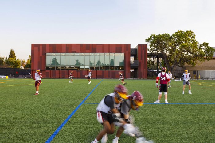 The upper level’s exterior circulation faces the tree canopy and includes overlooks with views of the tennis courts and soccer field. One overlook includes an operable outrigger arm for physics students’ free-fall experiments. The interior spaces are designed for flexibility, including large rolling lab tables and a collaborative workspace.