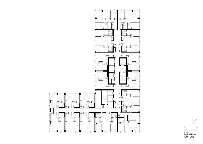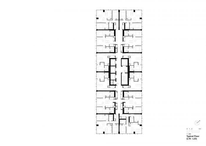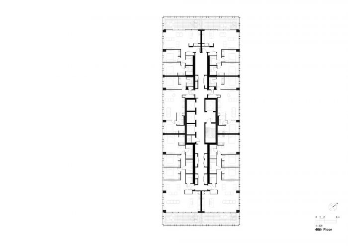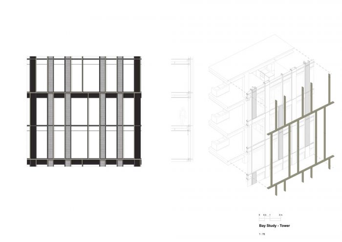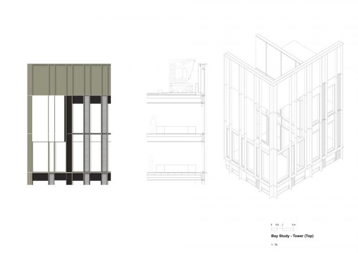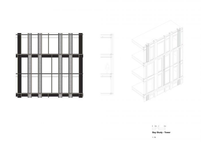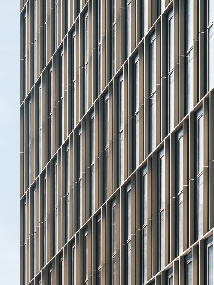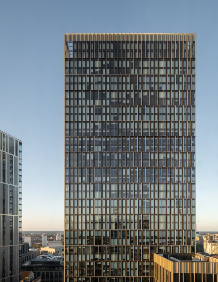 高大修长的塔楼耸立在预制石料覆盖的裙楼之上,被青铜金属片和玻璃板的动态组合所包裹。这个立面强调了建筑形式的垂直性和优雅性,带来了色调和纹理的对比,并参考了曾经位于该地块的前蒂明斯黄铜厂。为了减少体现能源,最大限度地减少场地浪费,并在市中心有限的场地上提供一致的质量,外墙是由3600多块单元化的面板构成的,这些面板是由现场外生产的预制装配而成。