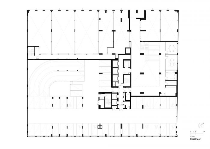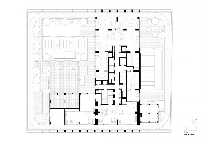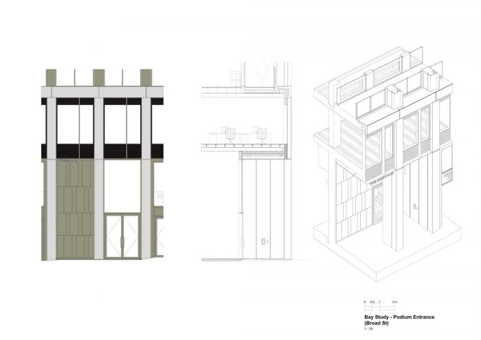 作为填充该地块的三层裙楼的一部分,灵活的商业单元的活跃正面现在与Broad街的地面相接,重新建立了该地区历史上的城市纹理,并改变了以前未被充分利用的空间。裙楼上还有一个三层高的门厅和接待区,以及店面和489个自行车存储空间,这些都促进了积极和可持续的旅行,减少了建筑整个生命周期的碳排放。