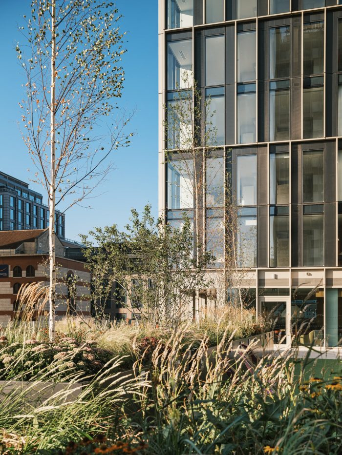 As part of a three-story podium filling the site’s footprint, an active frontage of flexible commercial units now meets Broad Street on ground level, re-establishing the urban grain that has historically characterized the area, and transforming a previously underutilized space. The podium is also home to a triple-height foyer and reception area, together with shopfronts and 489 cycle storage spaces, which promote active and sustainable travel, reducing the building’s whole life-cycle carbon emissions.