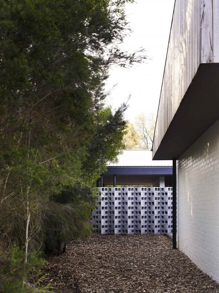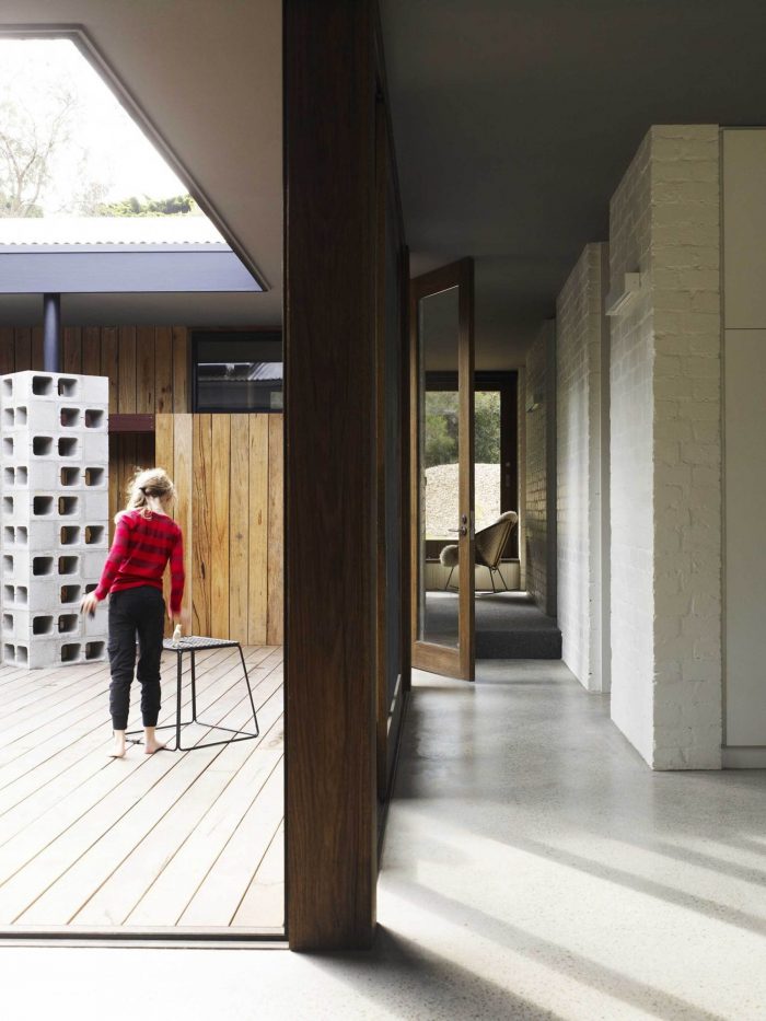 The bunk room which is located on the north edge of the internal courtyard has no doors and the king single bunks sit within their own alcove. This spacefeels dark and private and becomes a second living room when the house swells with people.Within this space thereare different places to be. There is no need for walls or doors. Light forms the threshold.