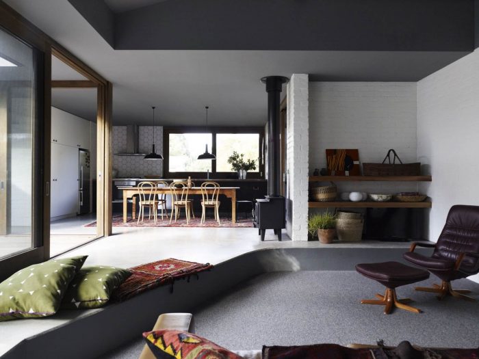 A slight fall across the site allows for the house to have 3 levels. The living pit sits below the central timber deck. It is a soft floor that allows you to be low and look out over the skillion roof to the trees in the surrounding area. Thepit edge becomes another of these in-between places. It is a place to sit and wide enough for a futon for an afternoon nap in the winter sun. The edge curves to become the hearth for the fire,finishing in a ledge for the television.