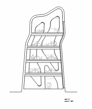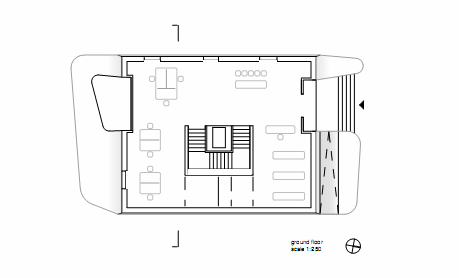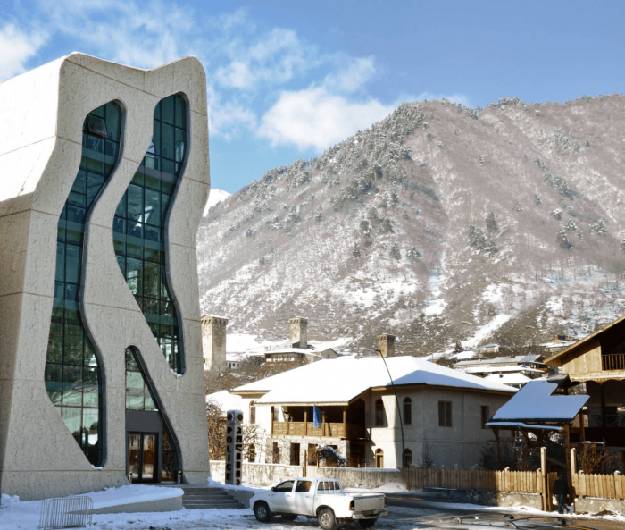 The project is situated in the heart of the old town of Mestia, next to the newly built city-hall. Its towerlike shape pays homage to the medieval stone towers which are traditional to Mestia’s mountainside region. The facade is comprised of prefabricated textured concrete and large openings which offer a maximum of transparency.