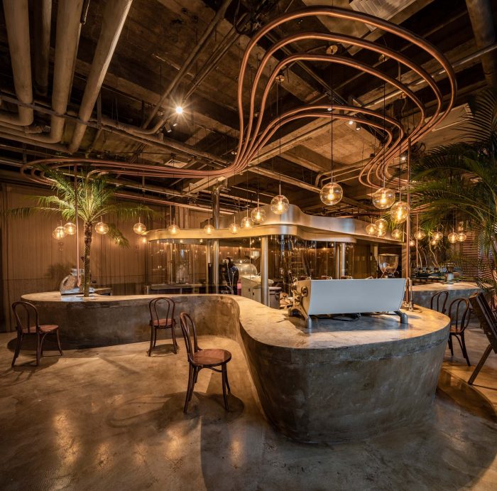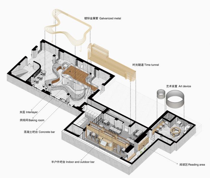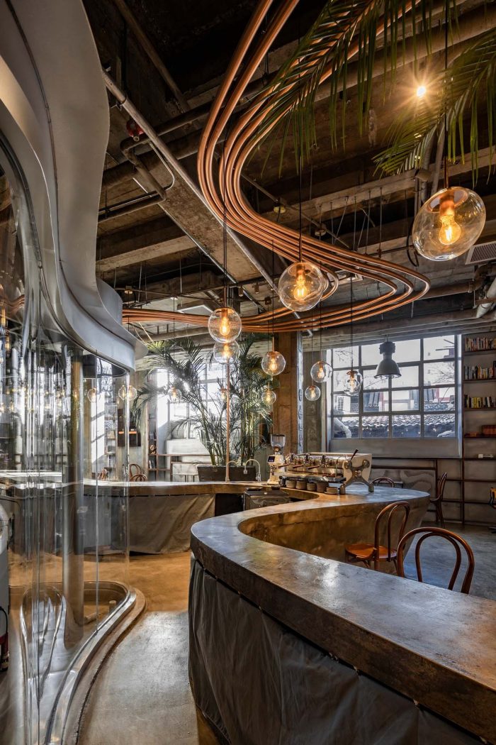 The lobby is transformed into the factory area, with a see-through roastery room surrounded by irregular-shaped and curved concrete bar counter. Customers sitting around the bar counter are able to observe the baristas as well as the factory as they operate. The counter is designed to be 800mm lower than regular bars, allowing closer exchanges between customers and baristas; the lobby retains and repairs the original concrete wall, ceiling and columns; on the ceiling, the element of pipe is utilized to design horizontal metal pipes that share the same contour as the bar counter. One of the pipes connects the water supply, with another three vertical pipes channeling the water to bar counter; the roastery room, with its silver-grey metal shell and see-through glass, has a mezzanine, which can serve as a storage area and training ground for coffee knowledge; a roaster runs in the roastery room, which, as a whole, creates the vibe of a factory with its sound, color and material.
