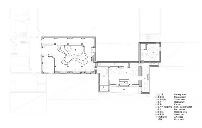 1.Spatial force: the overall space is connected by spaces of various sizes that were built in different yeras. The changing floor heights across spaces promise great potential for creativity. The first space is the lobby area, a frame structure with a ceiling height of 4.1 meters. The three huge skylight windows on the south, with their high windowsill, ensure ample lighting. A narrow corridor on the east leads to the second space, the sunken space. As the main house of the traditional Siheyuan, this space is a tile-roofed house with a wood structure, which was originally used as the cafeteria of the rehearsal spot. A small courtyard, the only outdoor area of the whole space, sits in front of the house and ushers in sufficient lighting. Through the kitchen area comes the back-kitchen area, whose ceiling height of 4.35 meters allows much room for creativity.