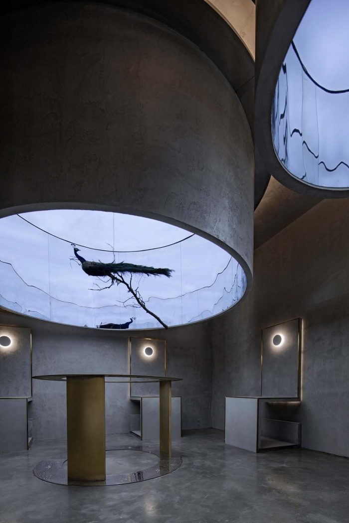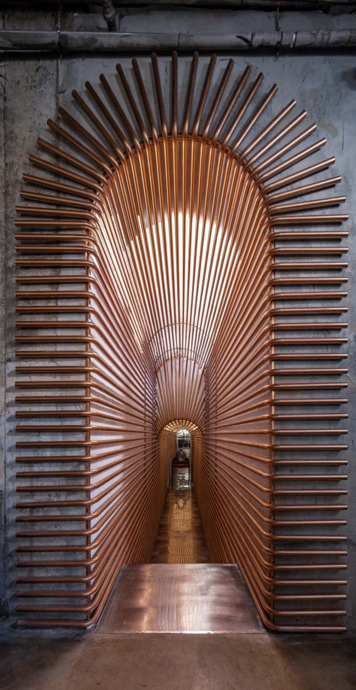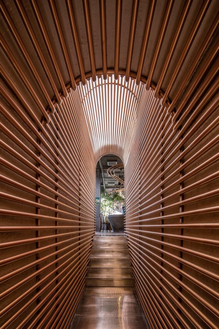 The factory area is connected to old times area with a time tunnel. As people enter this 11-meter long futuristic metal pipe, their curiosity and anticipation of what comes next spike. And when they arrive at the old times area, the change in spaces gives out the experience of time traveling; the old times area is renovated from kitchen area, with roof and windows of the old house being replaced and refurbished. The original wall and terrazzo floor are kept in order to create the vibe of old times; a smaller bar counter is set up between main house window outdoor courtyard to serve the old times area and art space. This counter has an enclosed shape, with 1/3 of it located outside and the rest inside. The counter opens on two sides and serves as a middle island to link the outdoor and interior during busy hours in summer. Customers are welcome to sit around the counter, where baristas can serve them from any angle. Furniture at the old times area is purchased by Mr. Ding, the shop manager, from abroad. The classic furniture brings back vibe of the past, strengthening the concept of old times.