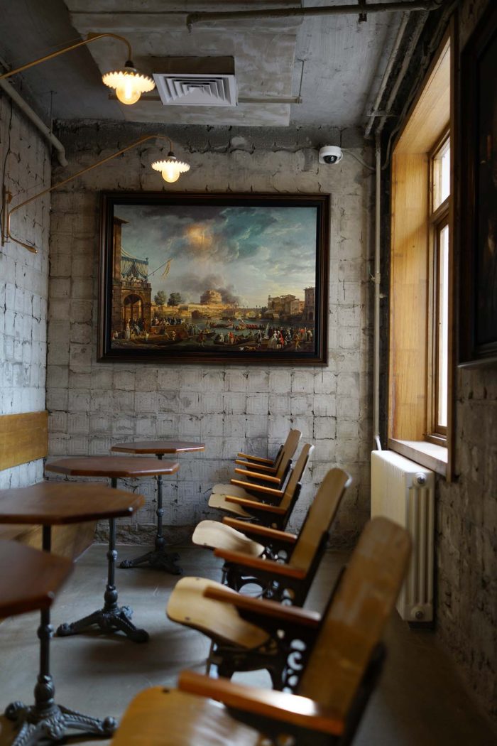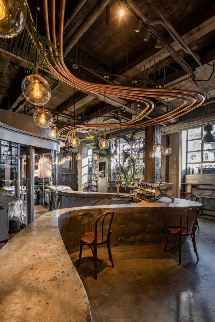大厅变成了工厂区,一个透明的烘焙室被不规则形状和弧形的混凝土吧台包围。坐在吧台周围的顾客可以观察到咖啡师以及工厂的运作。柜台设计得比普通酒吧低800mm,让顾客和咖啡师的交流更加密切;大厅保留并修复了原有的混凝土墙体、天花板和柱子;在天花板上,利用管道元素设计了与酒吧柜台轮廓相同的水平金属管道。其中一根管子连接供水,另外三根垂直管子将水引到吧台柜台;烘焙室,银灰色的金属外壳和透视玻璃,有一个夹层,可以作为仓储区和咖啡知识的培训场地;烘焙室里有一台烘焙机在运行,整体来看,它的声音、色彩和材质营造出工厂的氛围。