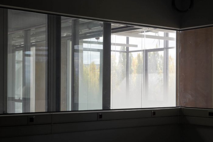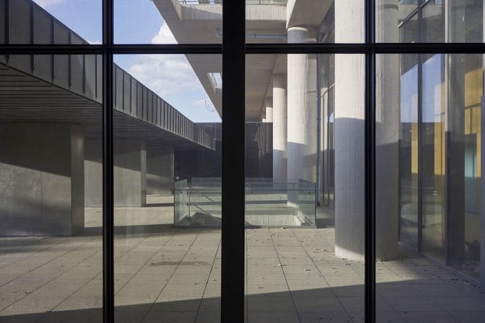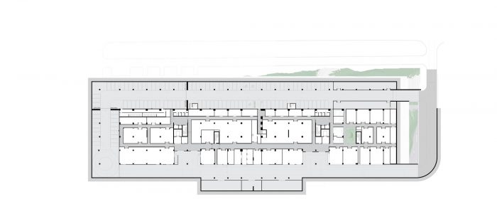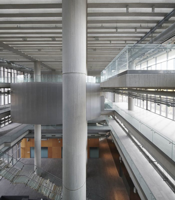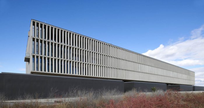 An atrium at the center of the space serves as a meeting area. Aside from research laboratories, classrooms, meeting rooms, and conference spaces are part of the 26,500-square-meter (285,243-square-foot) project. The new research center was conceived to be part of a complex that includes the university campus and a techno park.