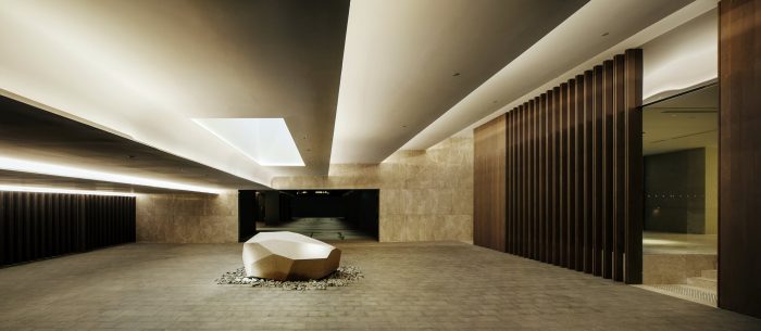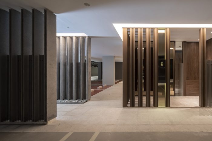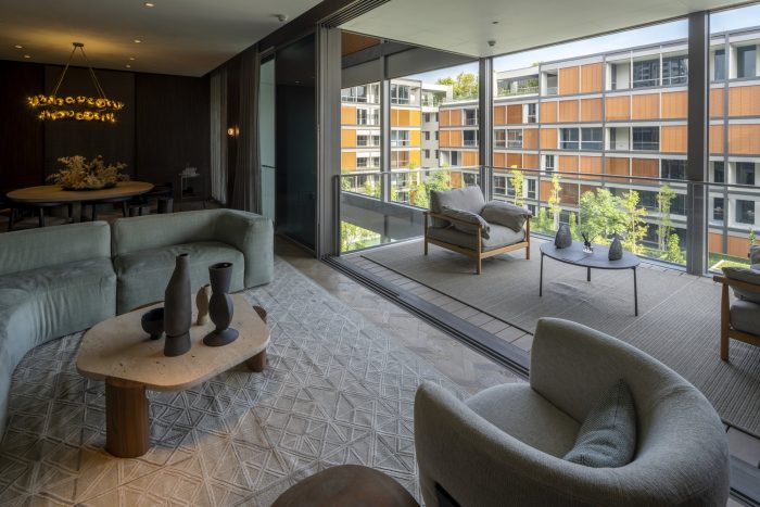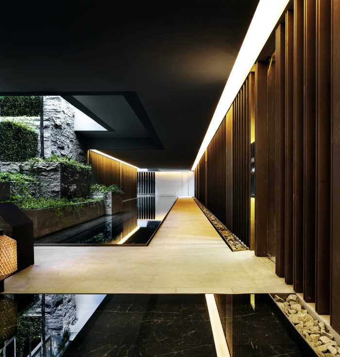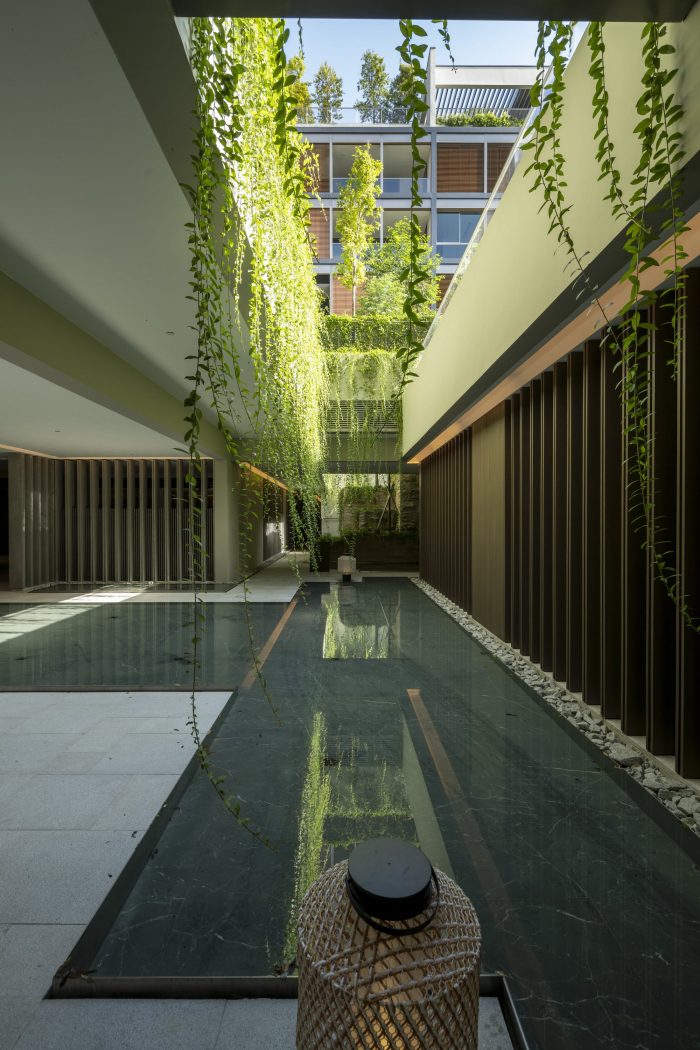 Living spaces extend onto large outdoor rooms nestled amongst tall forest trees set amidst a formal garden. Terracing gardens and water bodies cascade down onto a lower ground arrival level, opening up the subterranean arrival lobbies and facilities to natural daylight, ventilation, and greenery.