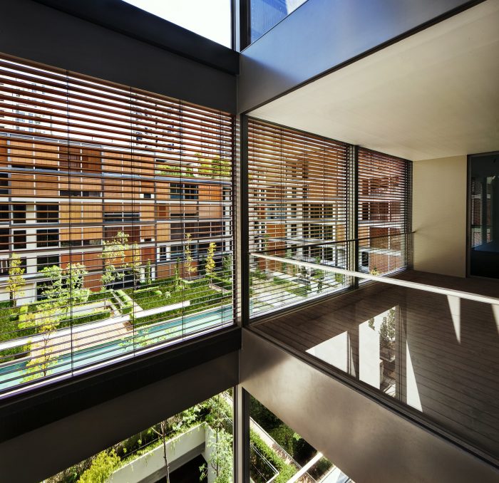 Typical residences feature a 12m long living area with full height large panel glazing that opens out to the forested internal garden. Automated Venetian blinds allow owners full control over privacy and daylighting, ensuring the long views out onto the gardens are protected.