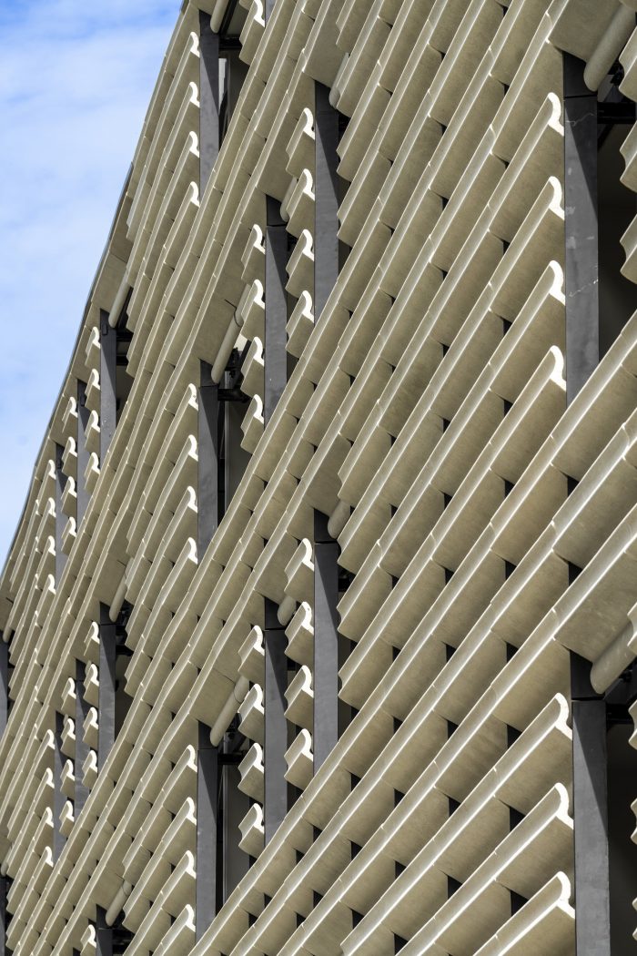从街道上看,该建筑是按照传统城堡的比例设计的,其庄严的外墙是由定制的GFRC百叶窗和镶板组成的,包围着整个造型。百叶外墙是倾斜的,以确保从街道层面的单位的隐私。外墙装饰延伸到屋顶,创造了一个雕塑般的抽象围墙。