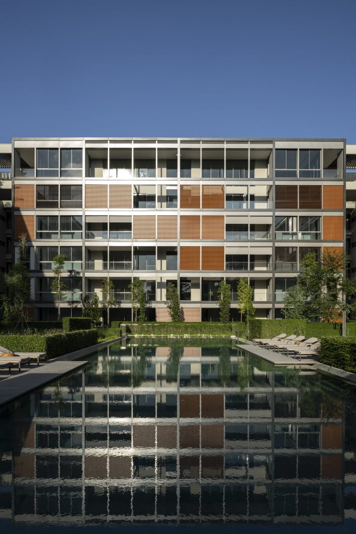 在内部,森林花园被木制百叶窗包裹着,这些百叶窗为住宅提供了温暖和特色的宁静的花园空间。在花园里,一个长长的游泳池沿着森林公园的主要轴线集中设置,反映了高大的树木和开发项目的温暖外墙。游泳池被客人和娱乐设施所俯瞰,这些设施包括一个宽敞的20个座位的餐厅,一个舒适的休息室,以及户外活动平台。