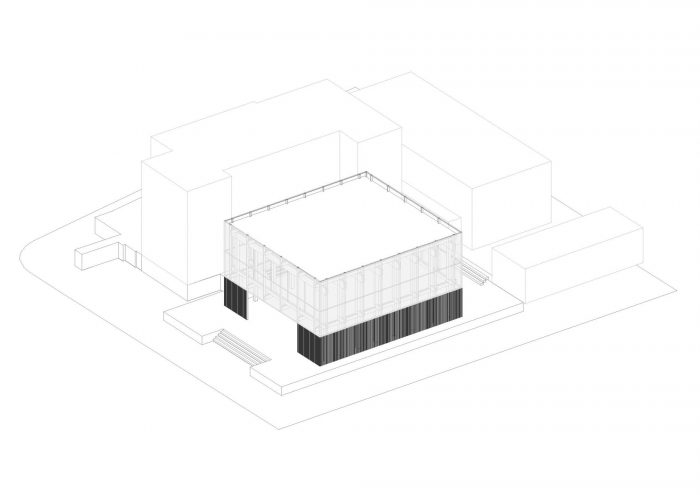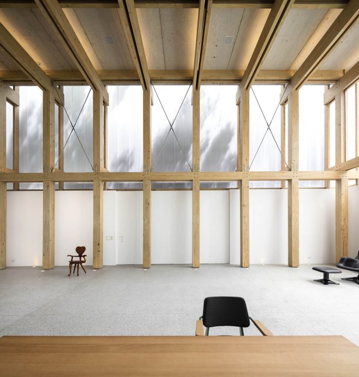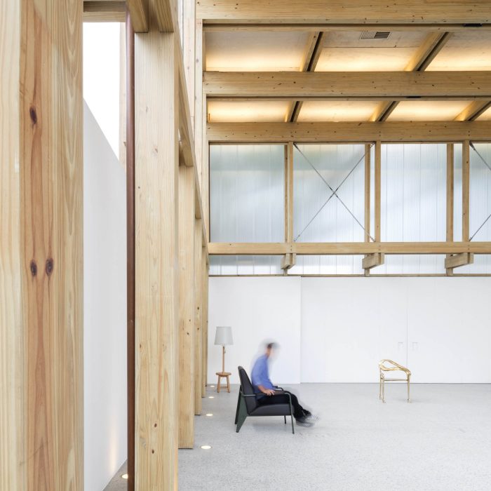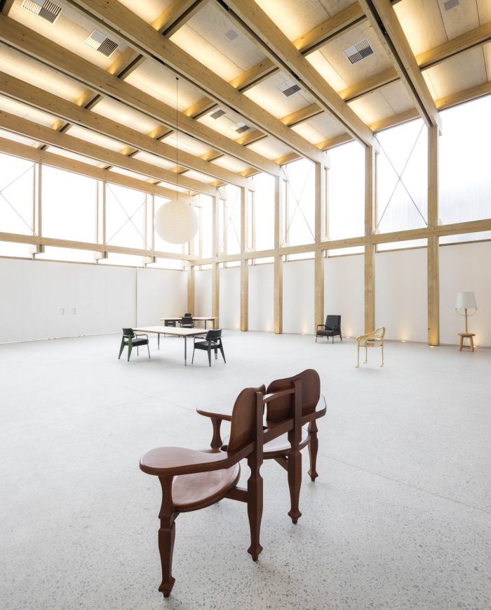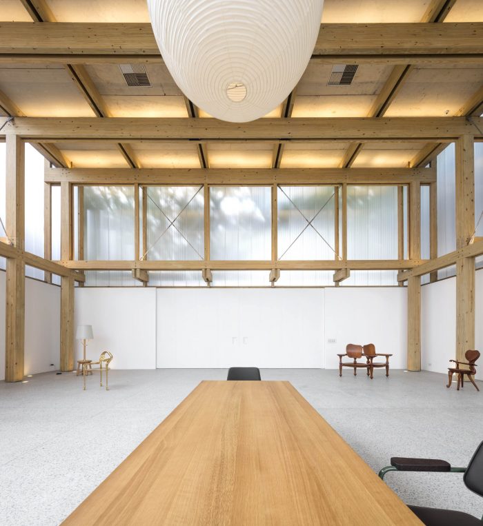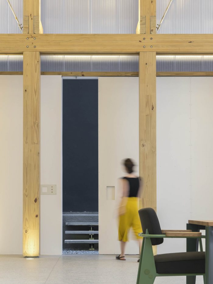 The demand for a flexible program led to the creation of an internal space that allowed for several possible uses: shop, exhibition space or temporary residence for invited artists, on a caravan that fits inside the space. The resulting space is a 15x15m floor plan with a 7,5m ceiling height. An Isamu Noguchi's pendant lamp punctuates the double symmetry of the space and explores its vertical dimension.