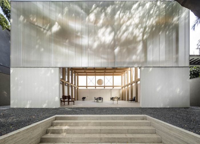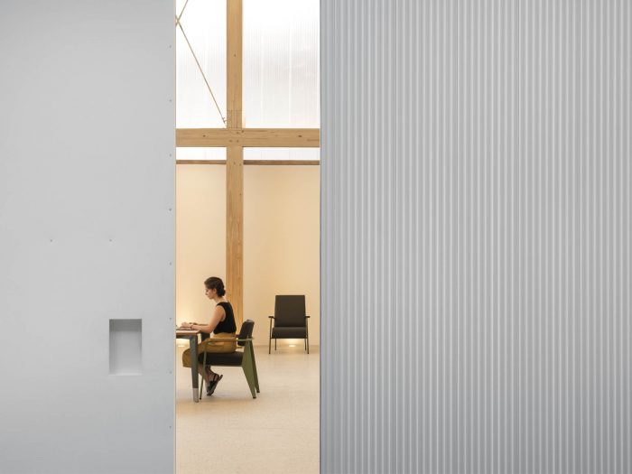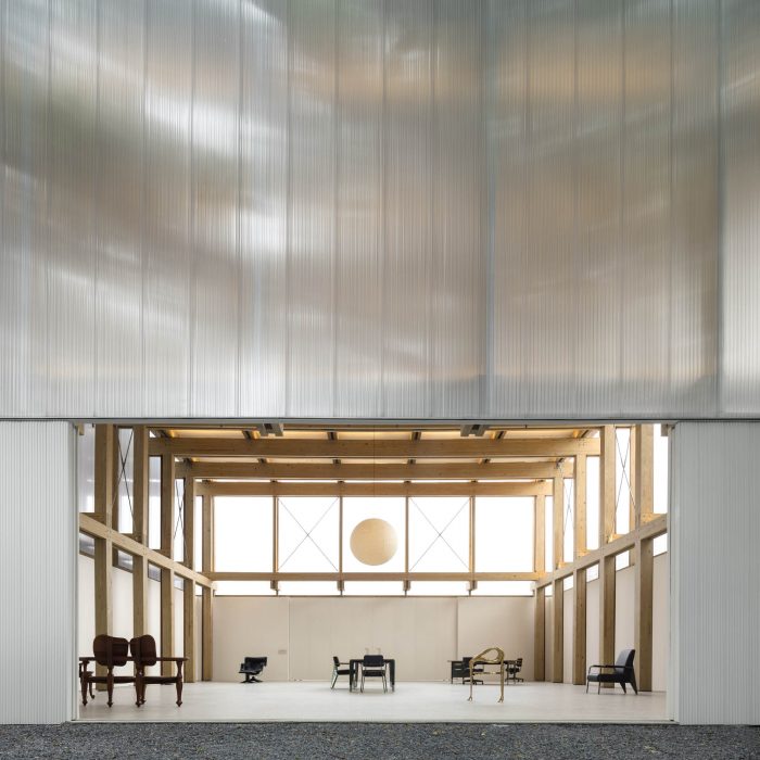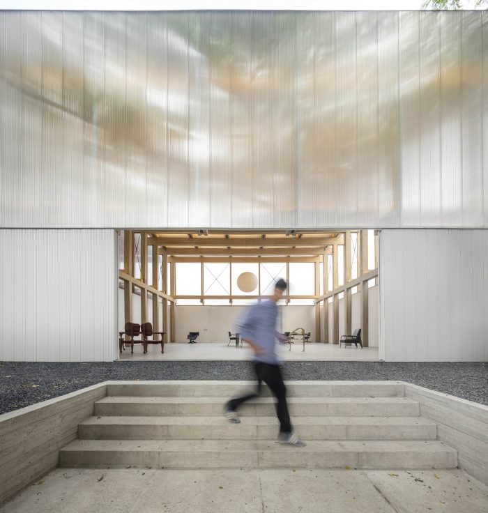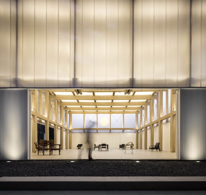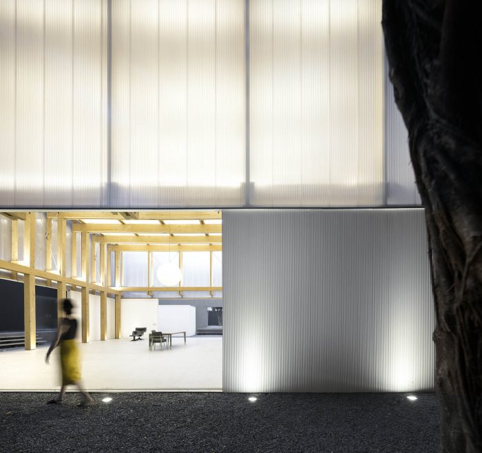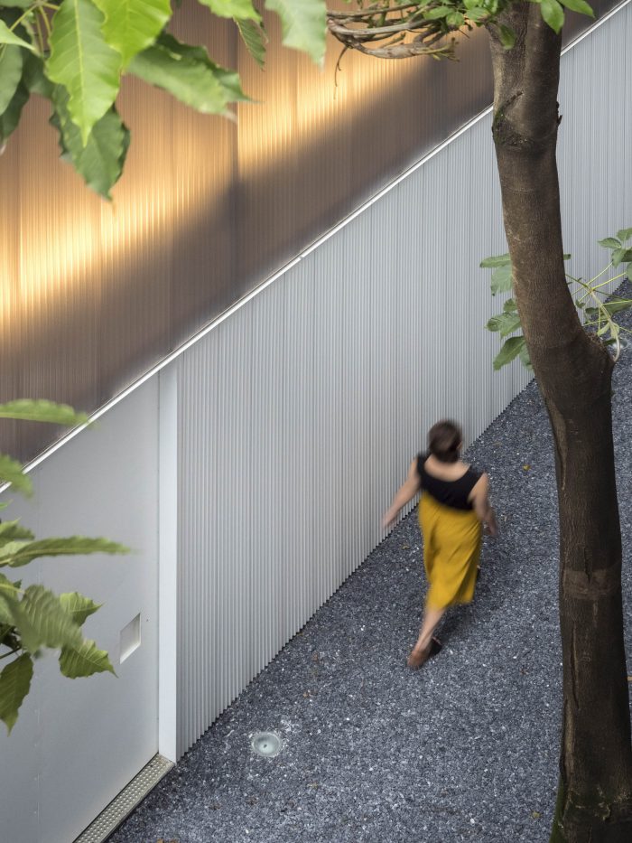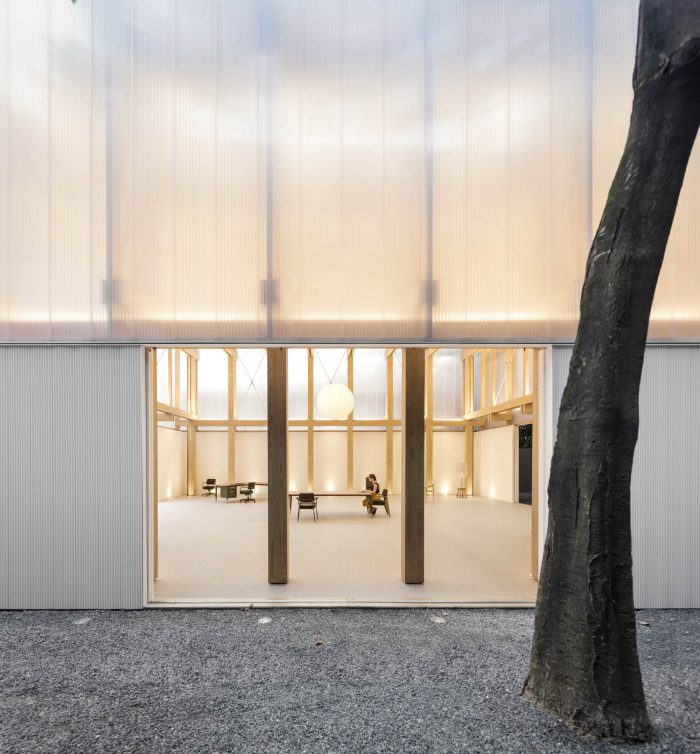 The building’s envelope is made of folded sheets of two different materials: translucent polycarbonate in the upper half and a white metal plate in the lower one. During the day, the shadows of surrounding trees are projected onto the façade, bringing the poetic movement of light and nature into the inner space.