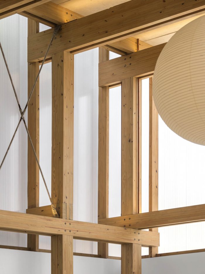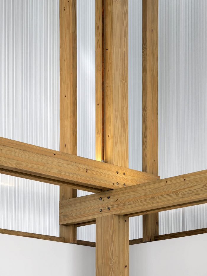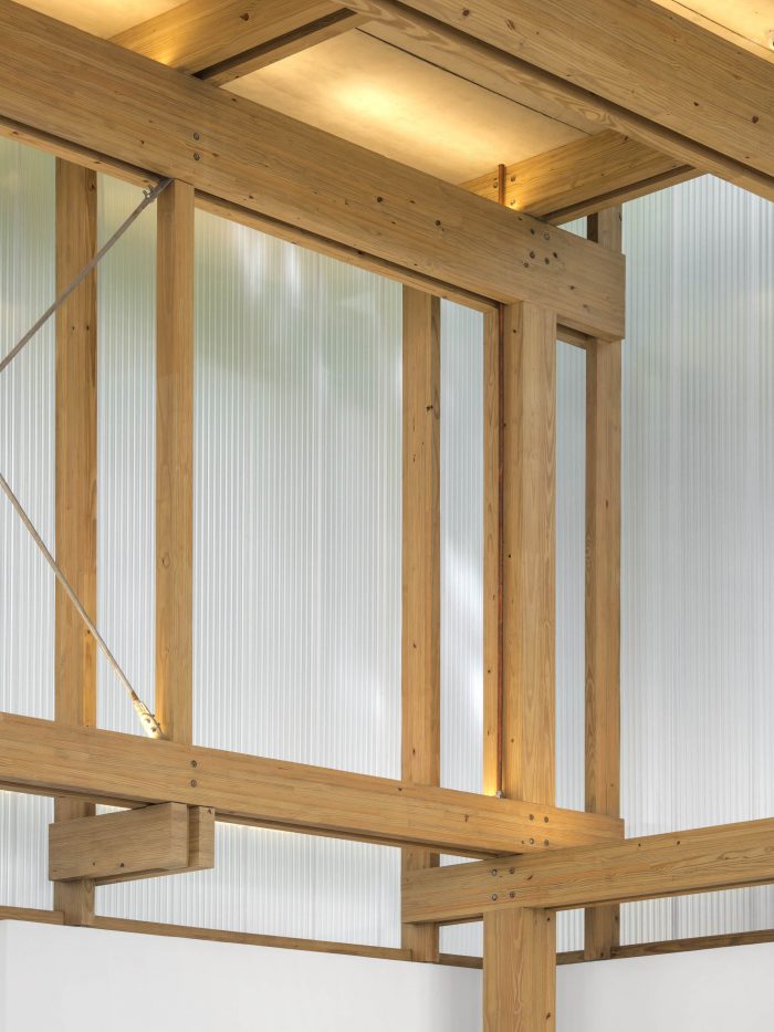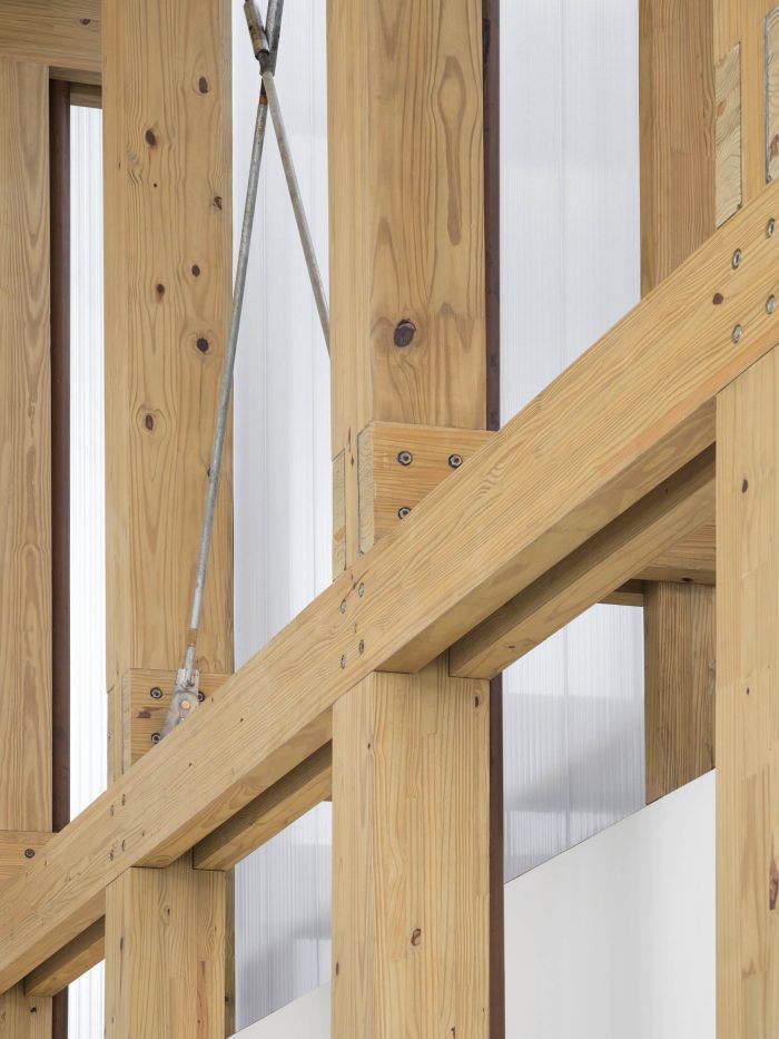 一连串的胶合层压木材框架克服了近15米的跨度。每两个模块,在上层平面,钢棒被用来支撑结构。