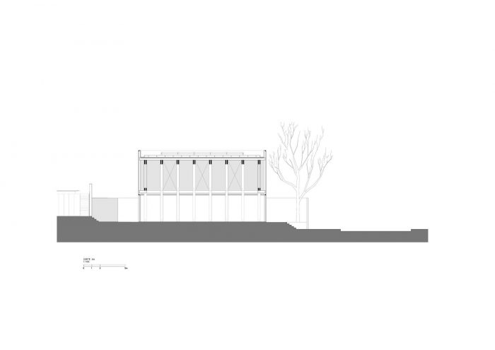 A substructure supports the skin of the building and creates a gap between the plane of the façade and the pillars. This distance reinforces the reading of the rhythm and of the simple fittings of the wooden elements.