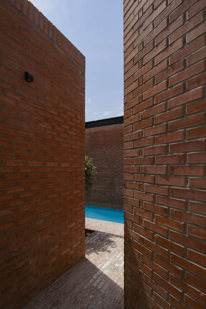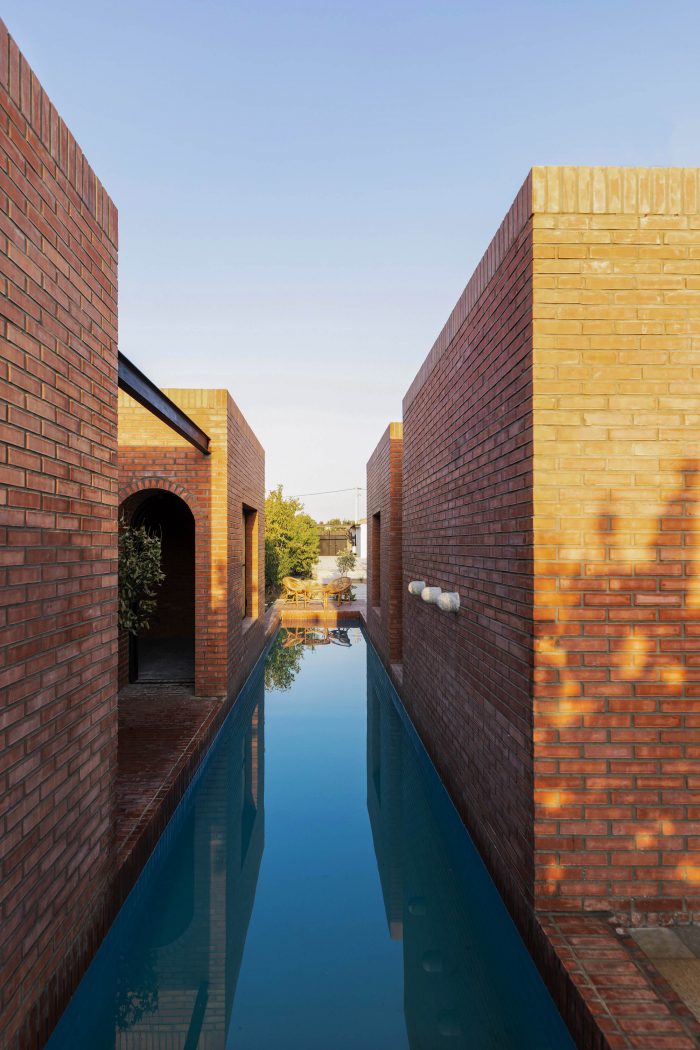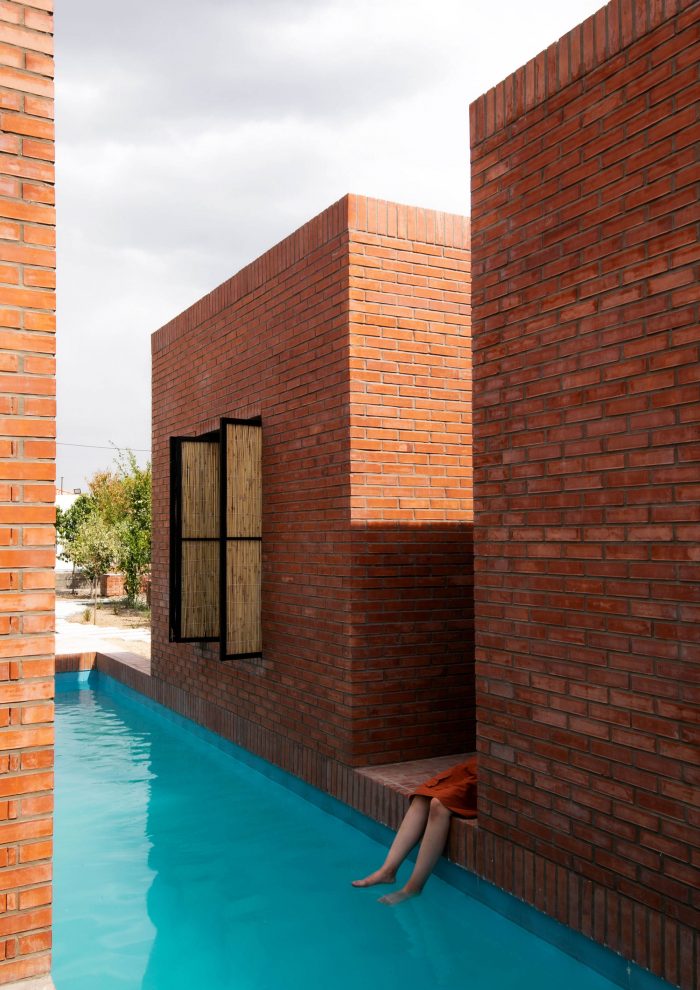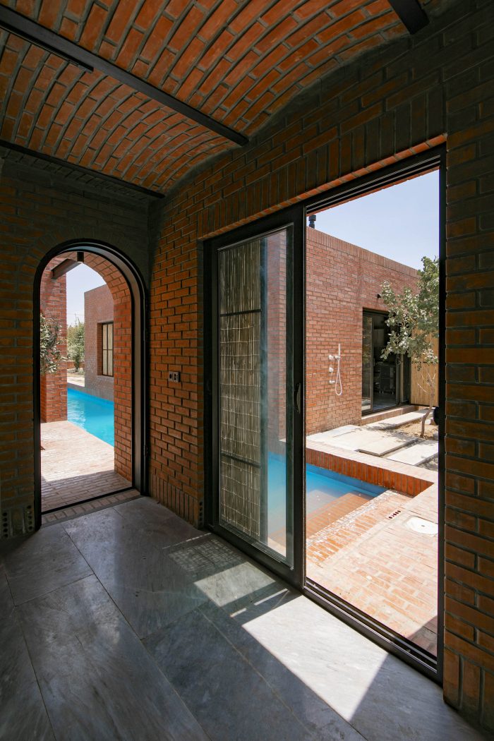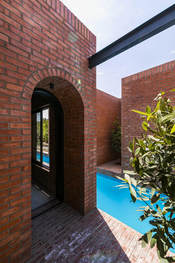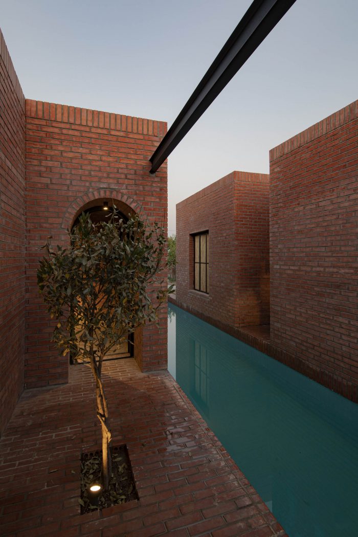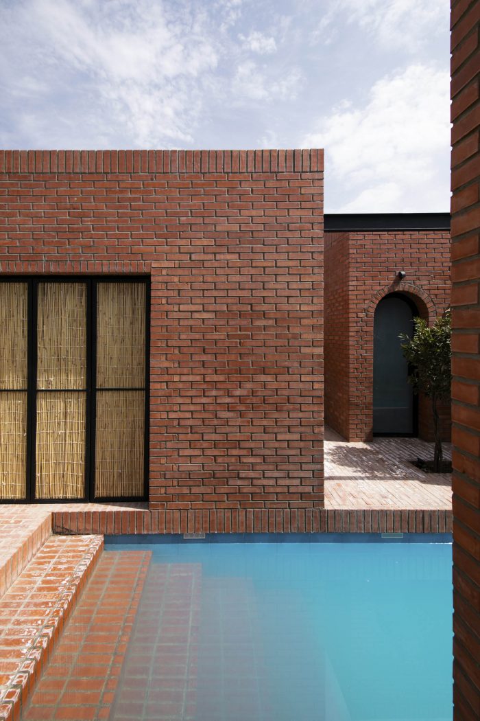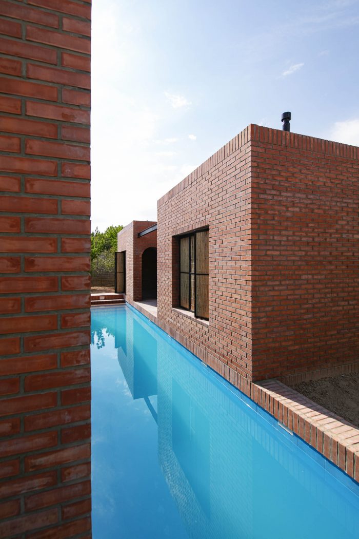 The juxtaposition of the brick volumes in a hidden zone seeks to honor the authentic quality of natural materials and highlights the relationship between human beings and nature over time. Mid-ridge villa is made of ochre brick that complements the palette of the landscape: blue sky, green vegetation, yellow sandy ground, and, therefore a red house.