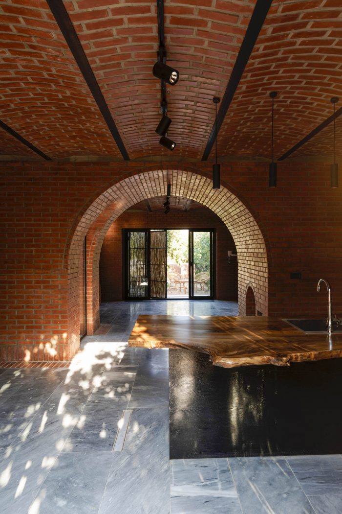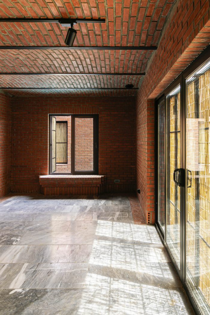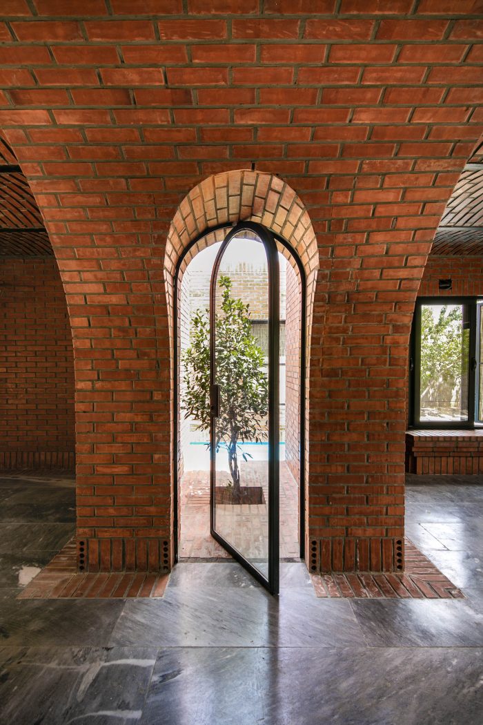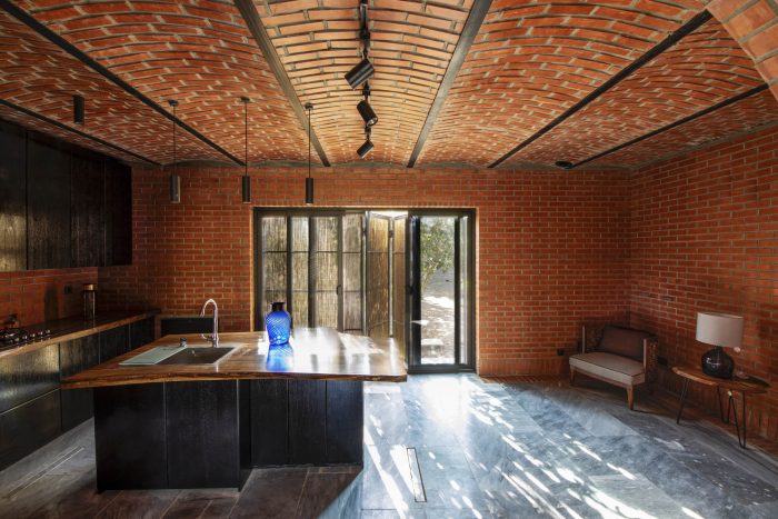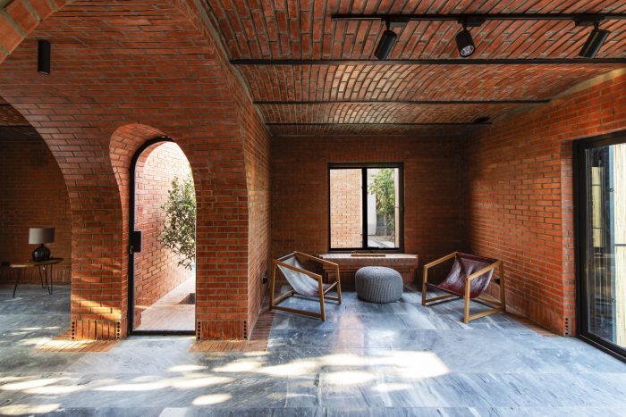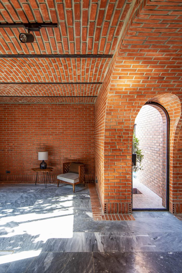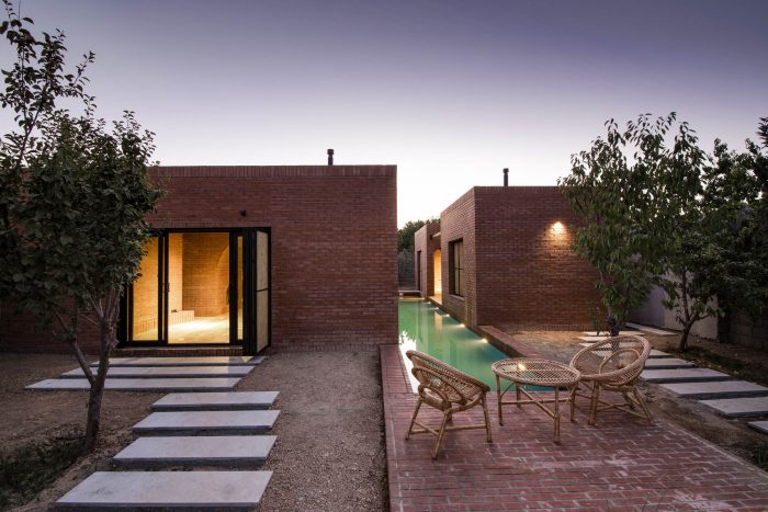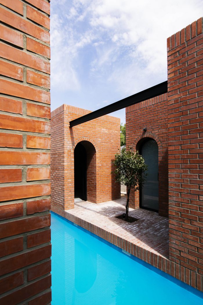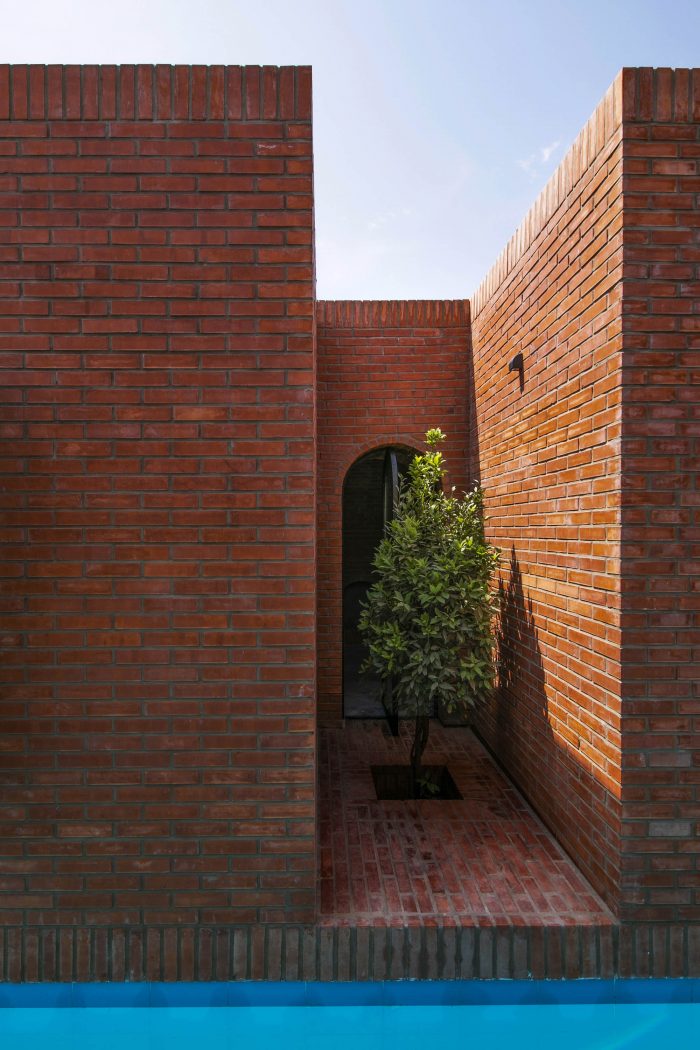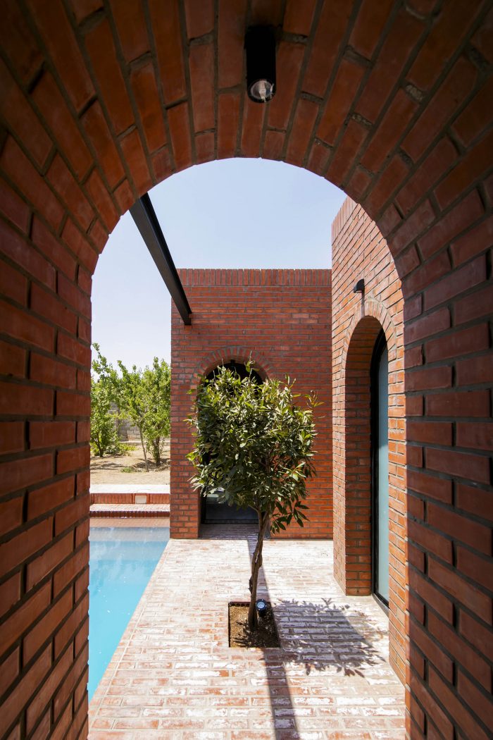 The juxtaposition of the brick volumes in a hidden zone seeks to honor the authentic quality of natural materials and highlights the relationship between human beings and nature over time. Mid-ridge villa is made of ochre brick that complements the palette of the landscape: blue sky, green vegetation, yellow sandy ground, and, therefore a red house.