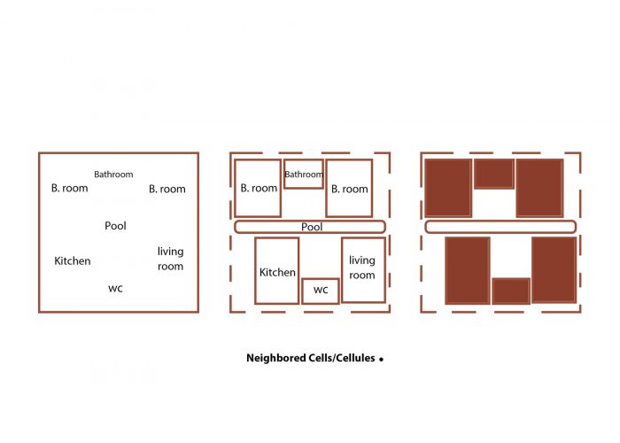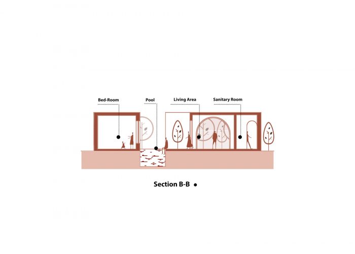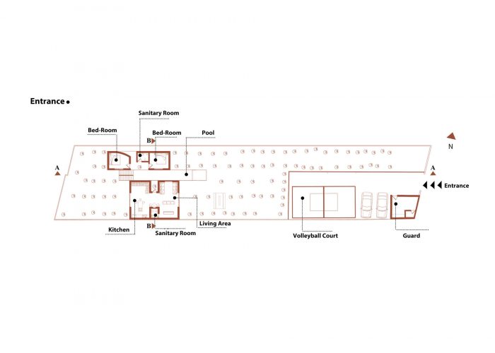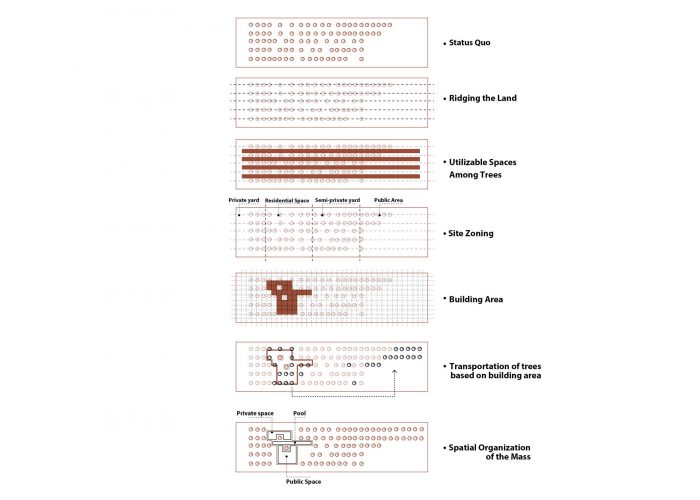 Mother's poetic nature has made promenading a necessity, therefore spaces among the trees and easy access to them have been selected as the best answer to the question. On the other hand, to elevate privacy matters in private zones due to the mother’s obsession, the swimming pool turned into the main gap between the private and public zones.