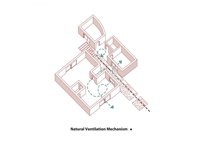 Fruitful trees in the garden, which were necessary to maintain in order to respect the environment, is one of the design limitations that has turned into an opportunity during the process of organizing the mass between the empty spaces (Ridge) of the trees. The architect took these empty lots into consideration as a dwelling and daily activities.