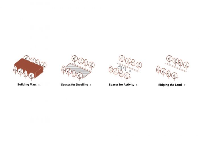 花园里的果树,为了尊重环境而必须保持,是设计的限制之一,在组织树木的空地(山脊)之间的质量的过程中,变成了一个机会。建筑师将这些空地考虑为住宅和日常活动的场所。