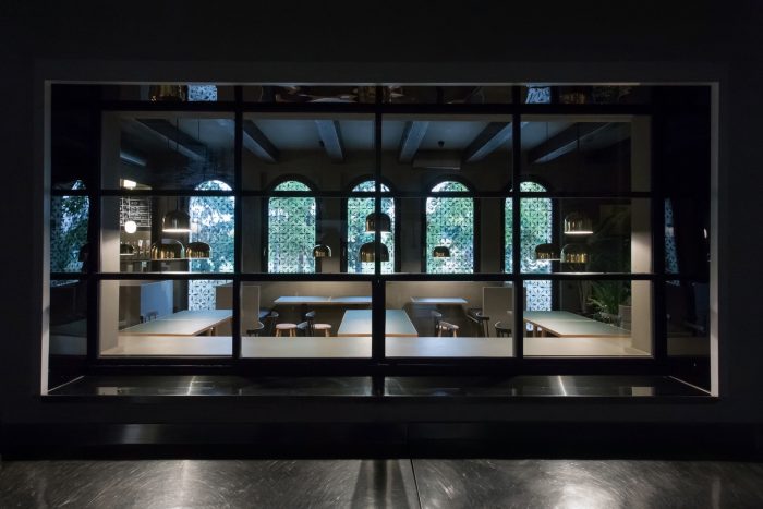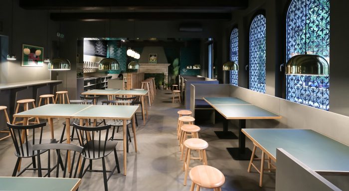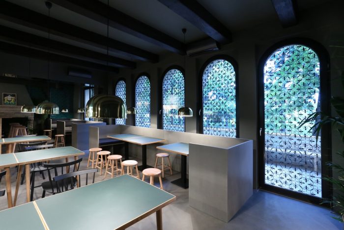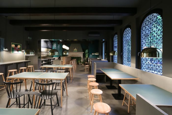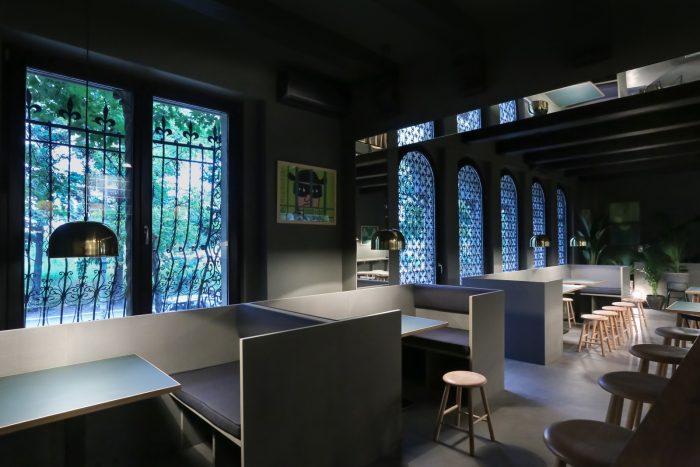 “The building has a very strong personality and a special relationship between the main interior with the square, being elevated almost one floor above the ground. Through a balcony located along the main facade, floating above the level of the foot way, a direct relationship with the square space is established by the extension of the interior space dominated by the high windows, protected by a decorative grid, part of the original architectural concept. Also, the interior architectural elements of the original house have been preserved and reintegrated in a complementary manner with the newly designed space: wooden beams and the stone fireplace, although part of a classic architectural vocabulary, become components of a contemporary, abstract language. The interior design exploits and amplifies the intimate, nostalgic, warm and cozy atmosphere of the building, creating a timeless interior, without following the battered way of historical quotes with pieces of period furniture, but by simplifying, reinterpreting and redesign the elements, making use of textures, dark colors and low dim light, which leaves the space in an incognito type of atmosphere, a penumbra, somewhat similar to the 30’s and 40’s period, allowing the evening lights of the square to be seen from a privileged angle. The contemporaneity of the space lies in the simple, almost symbolic lines of the volumes of the partitions located along the windows, without interrupting the interior relationship with the city, and by using the same gray wood material, abstracted for the furniture and for the floor, thus forming a common body, a unique volume that is placed inside the house and provides a framework and stand-alone setting for all other pieces of furniture. Tables with linoleum finishes, modern design chairs, and brass lamps are a contemporary reinterpretation of the 30’s and 40’s period, complemented by abundant vegetation, thus transforming space into a sophisticated urban salon similar to the culinary experience and specialty beer tasting,” explains Bogdan Ciocodeica