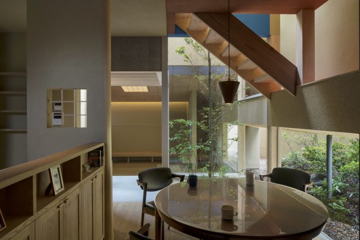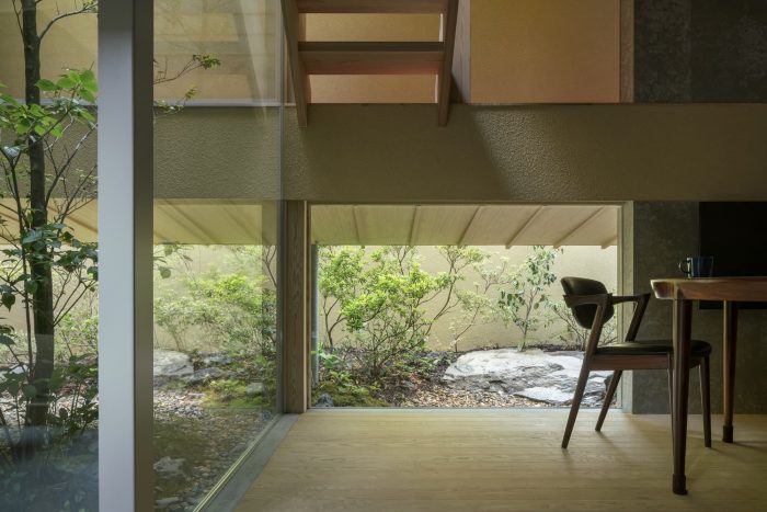The sunken living room on the first-floor functions as a space for entertaining guests, and the bench offers a view of the garden that extends under the bridge. From inside the room, this garden inspired by streams looks as if leading somewhere far away. Two small courtyards are situated between the living room and the more private kitchen-cum-dining area.