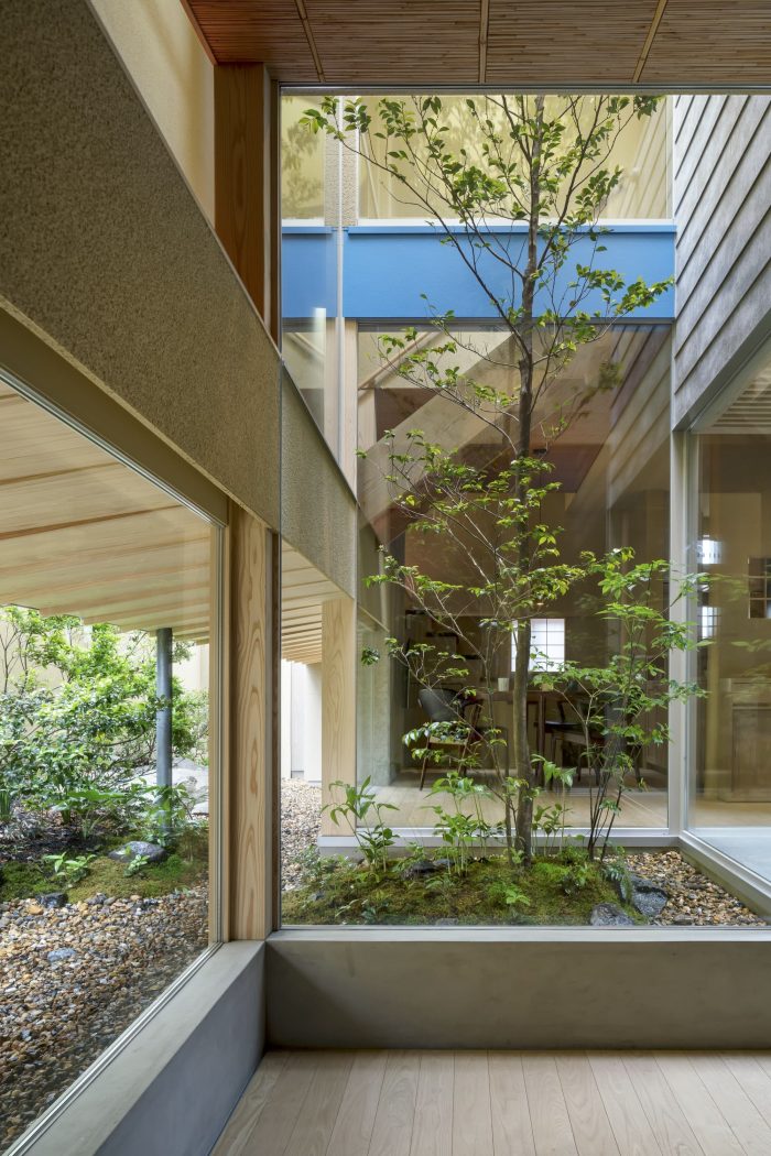 The corridor bridged over the garden, reminiscent of a garden path, overlooks the garden and the sky, leading to each private room on the second floor. The three gardens provide depth and expansiveness to the house.