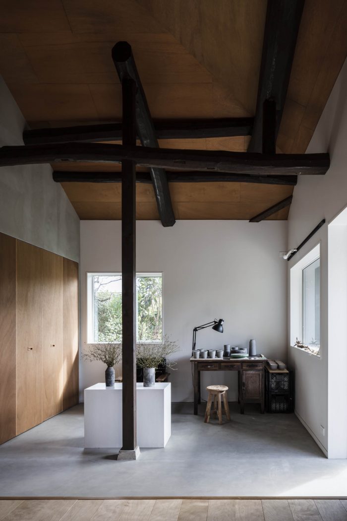 The hipped ceiling, which follows the shape of the roof, is about 4 meters high at the top, making it a very large space. The house is not only a residence but also a place of work and a gathering place for the community.