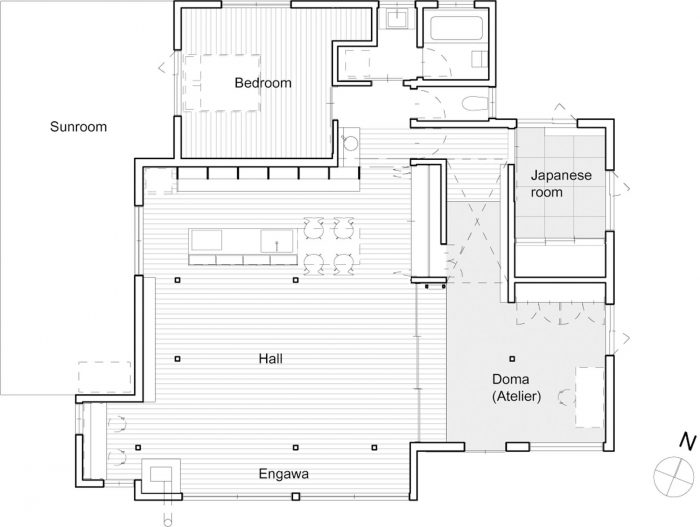 我们决定将房子重新配置成三个空间:供生产和客人使用的Doma(土炕)/榻榻米房间,白天的生活空间,以及睡眠空间。Doma和大厅由三扇推拉门隔开,推拉门可以打开,形成一个约90平方米的房间。