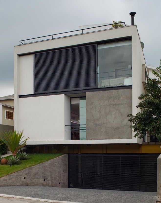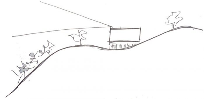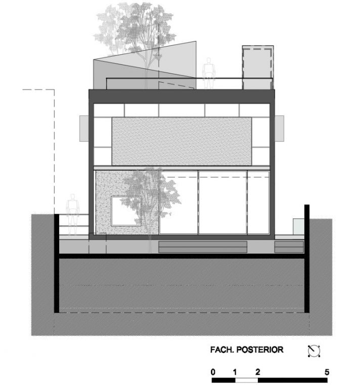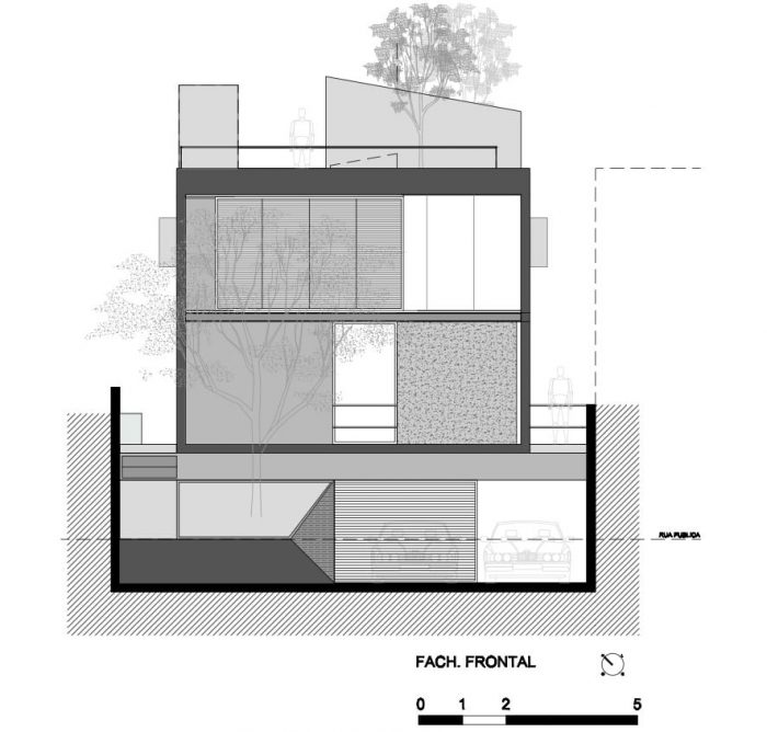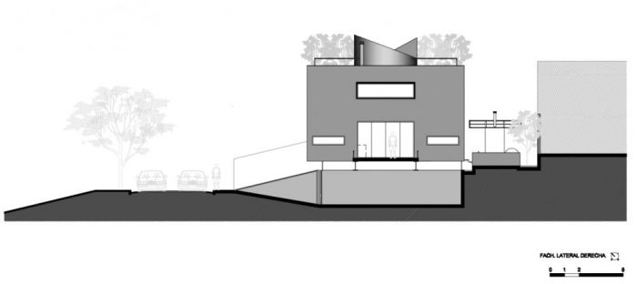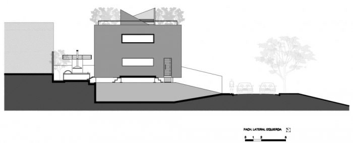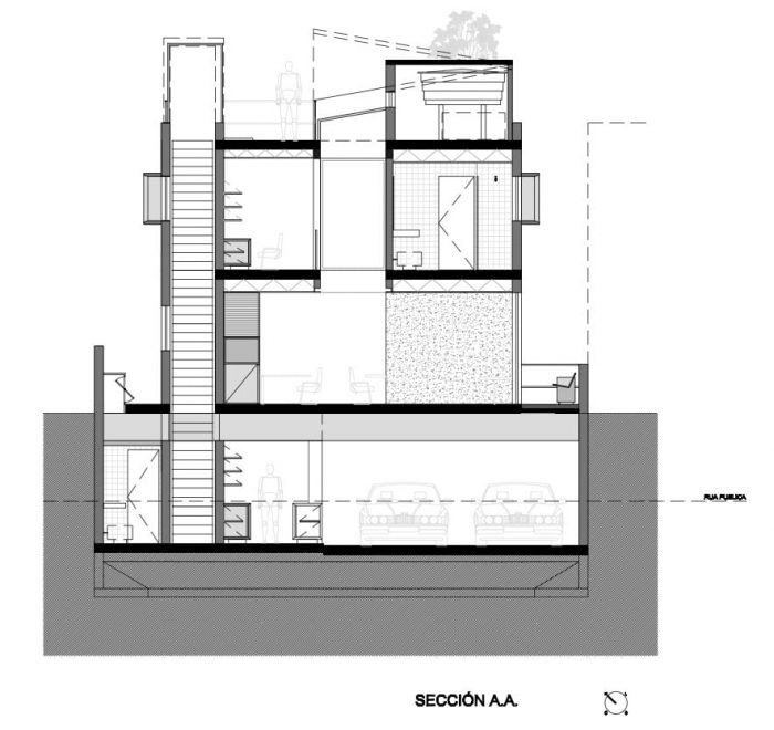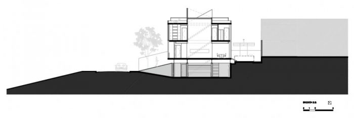 The service, adjacent to the garage, is four feet below street level. Above is the container with the other functions of the house. A shadow separates them.