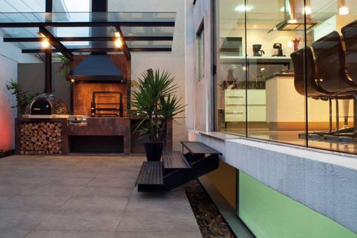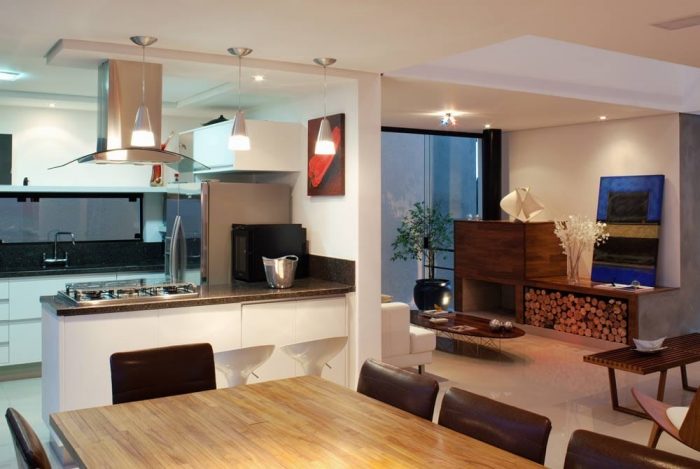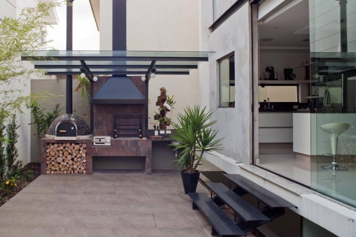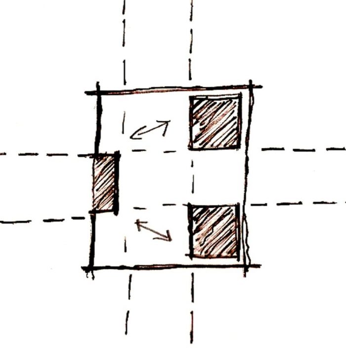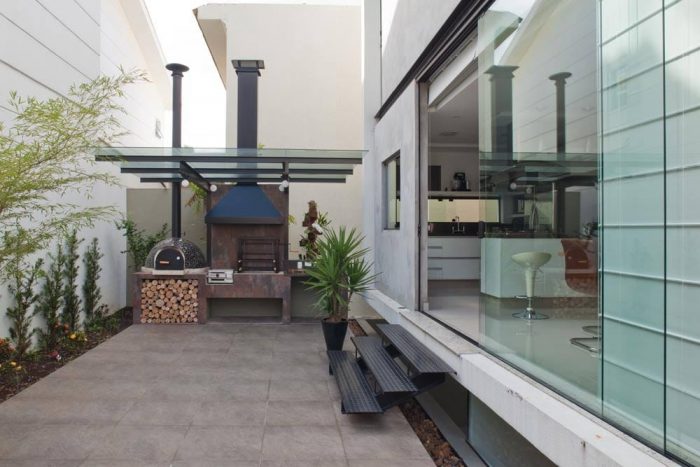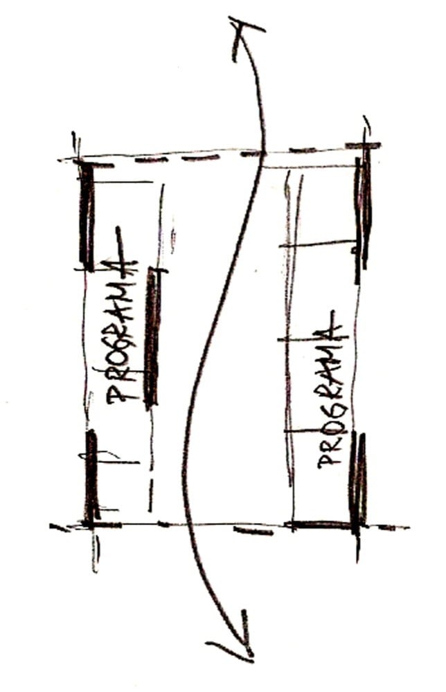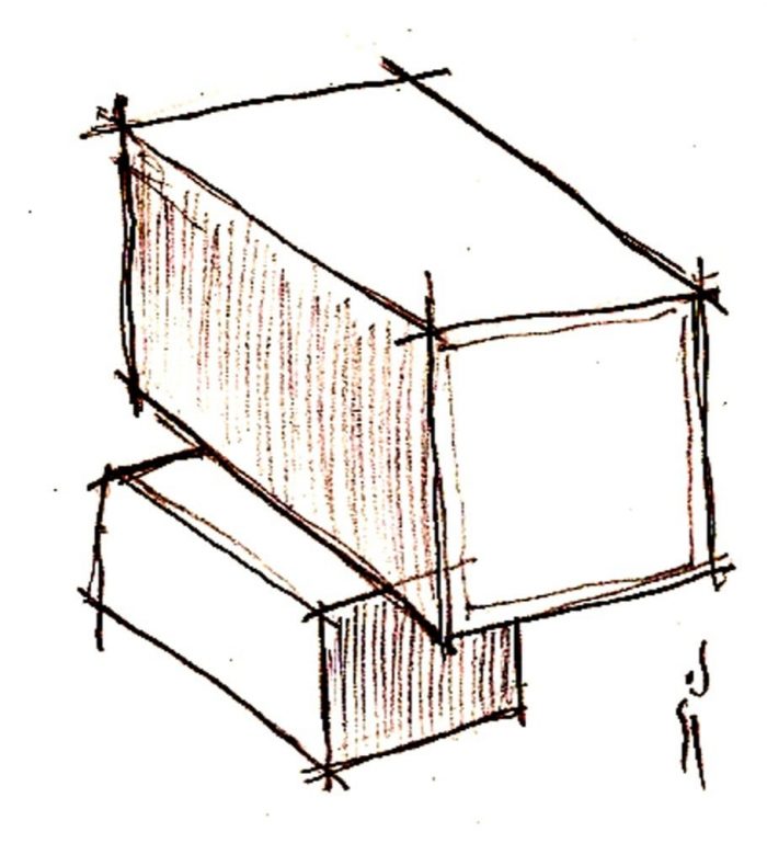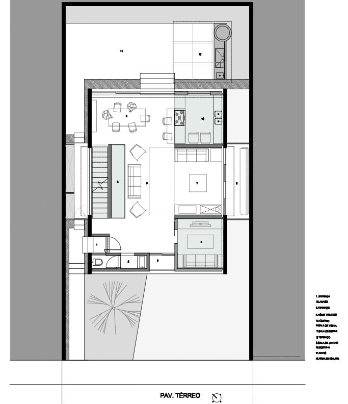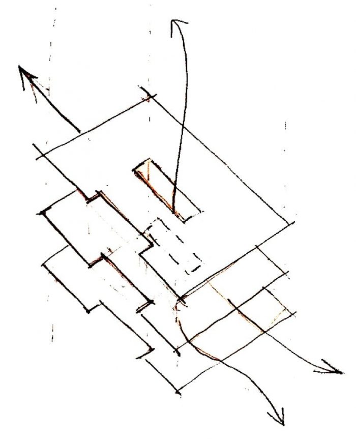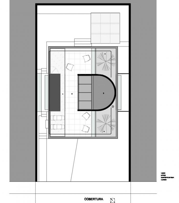 The space created inside, in fact, is what remains after adding three small "boxes". Dialectic interdependence between home theater, kitchen and stairway is established in the residence and demarcates a territory, as seen illustrated in the sketch next to this text.