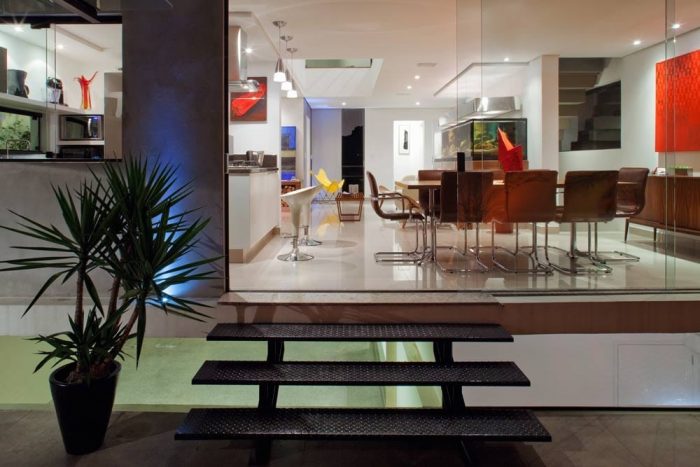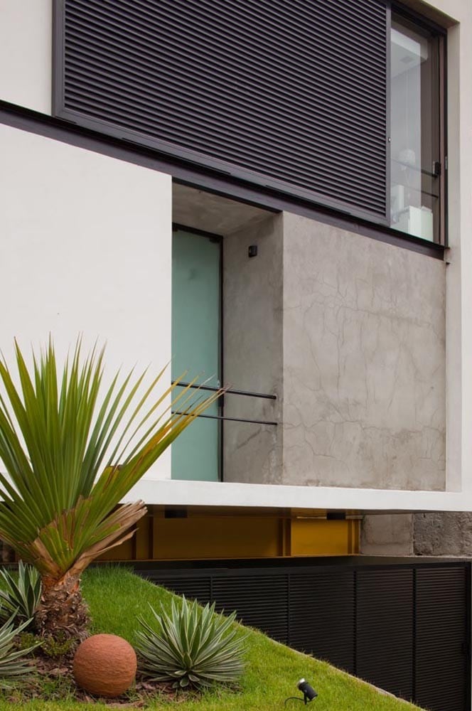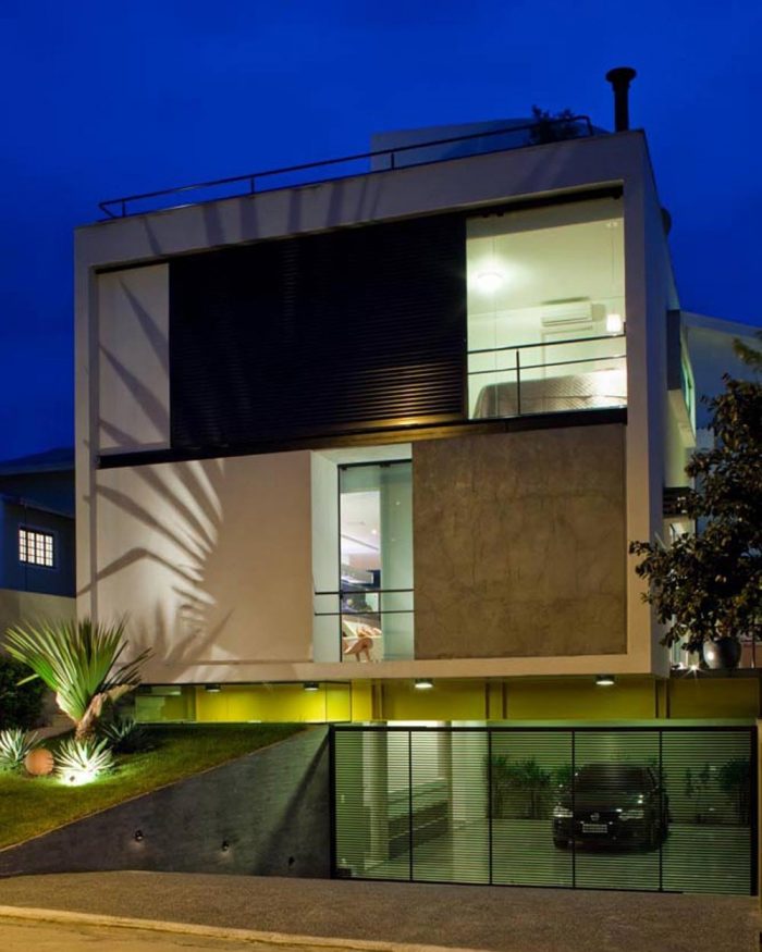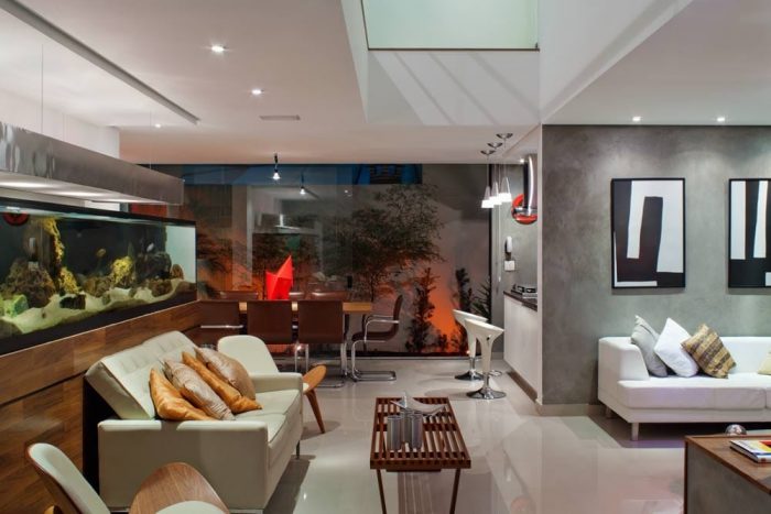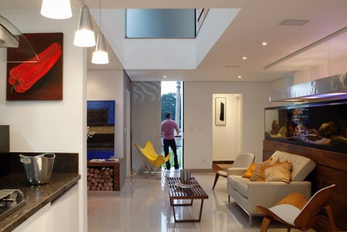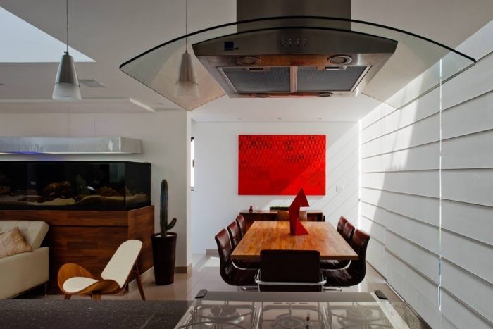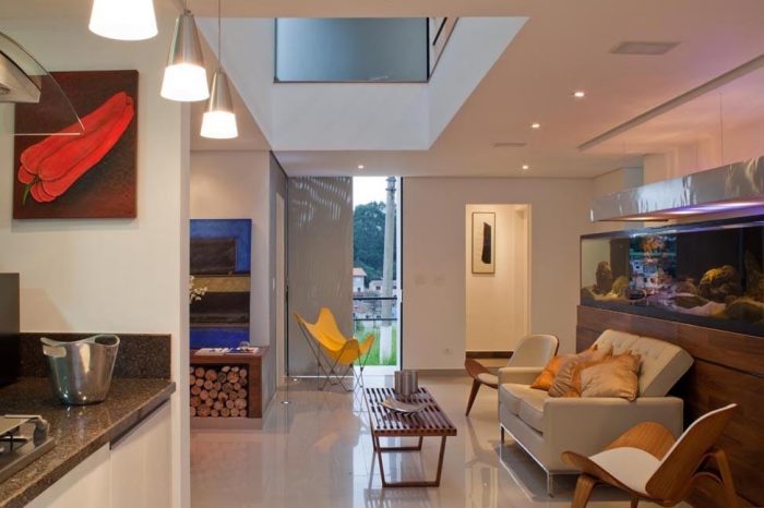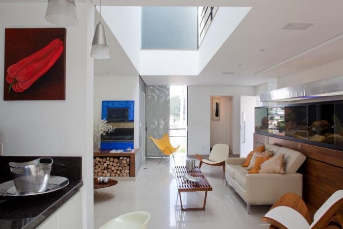 Connecting the house from top to bottom, the right wall next to the staircase inside the house offers vertical connections to the exchange of fluids between the four height levels, while providing space for a different event in each. On the garage floor, superior and top terrace, it generates the studio, office and support respectively, while in the main floor a large aquarium turns that wall in a prism.