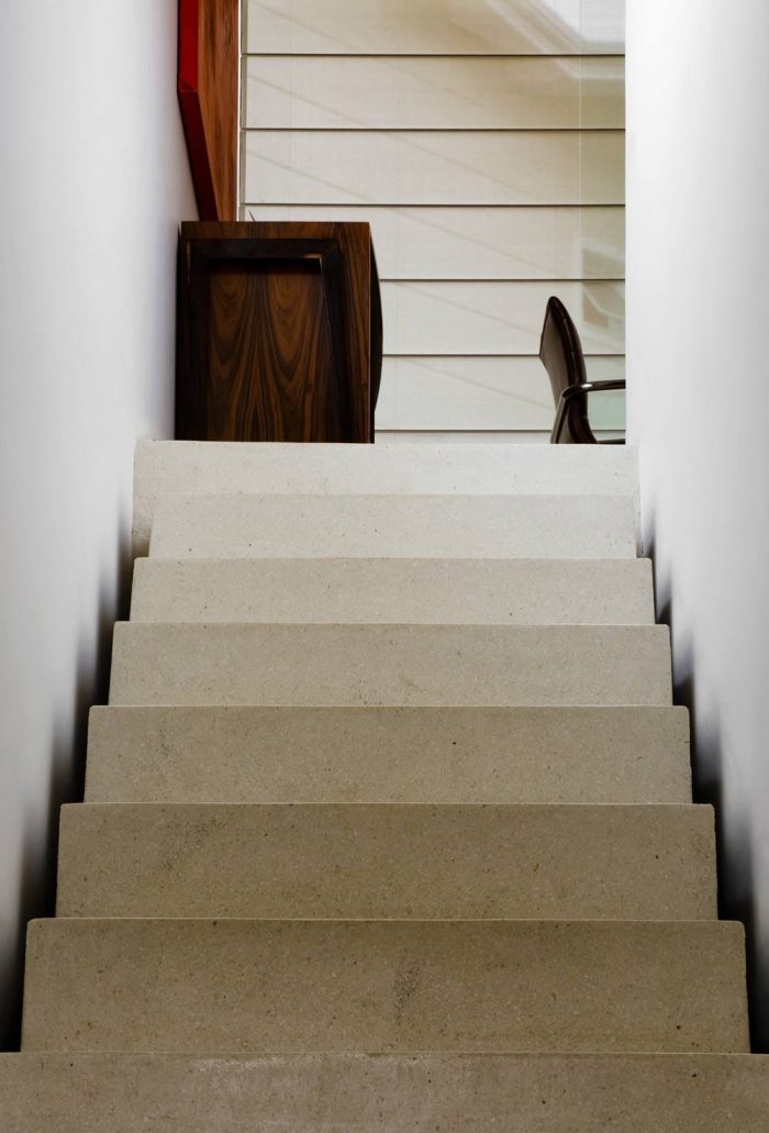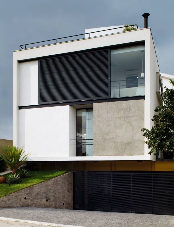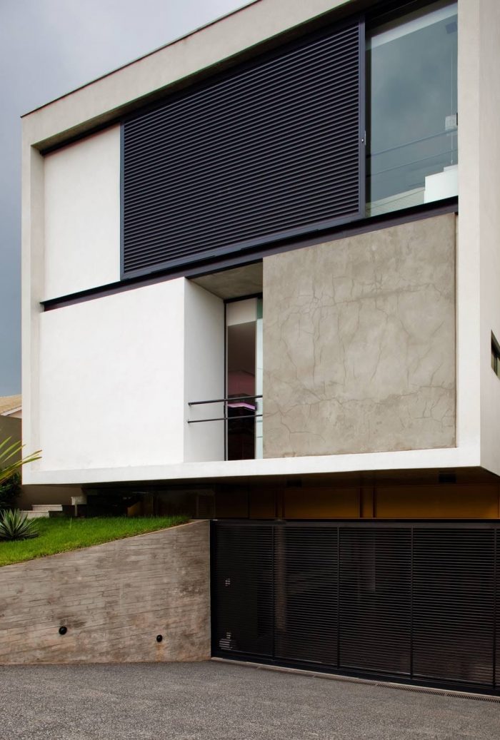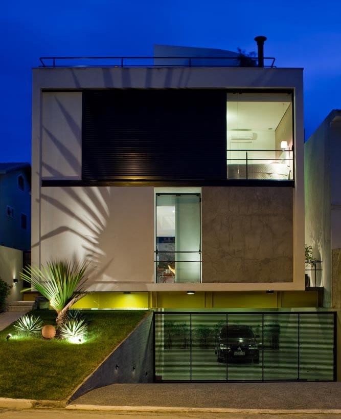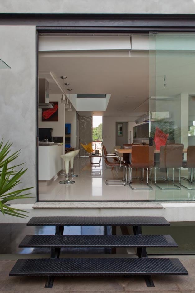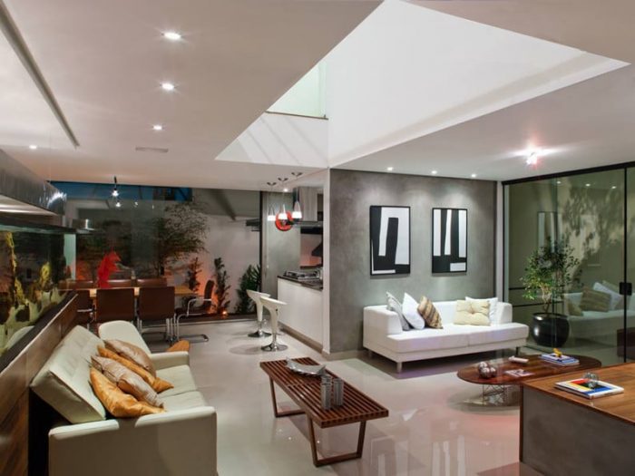 Connecting the house from top to bottom, the right wall next to the staircase inside the house offers vertical connections to the exchange of fluids between the four height levels, while providing space for a different event in each. On the garage floor, superior and top terrace, it generates the studio, office and support respectively, while in the main floor a large aquarium turns that wall in a prism.