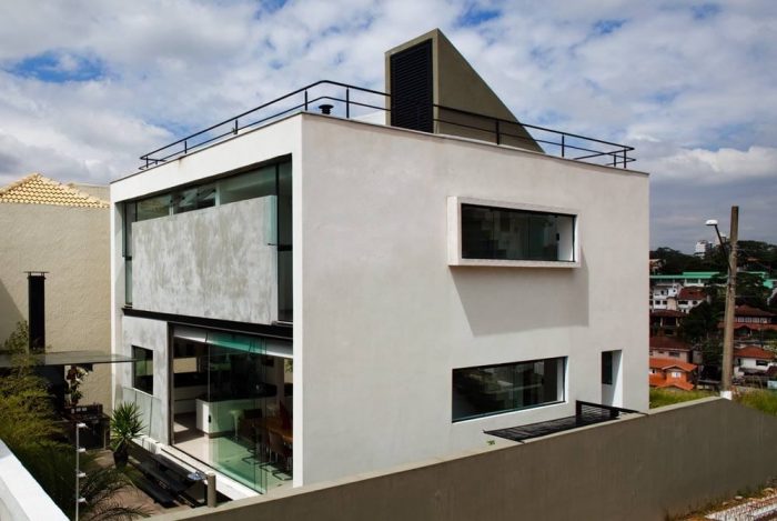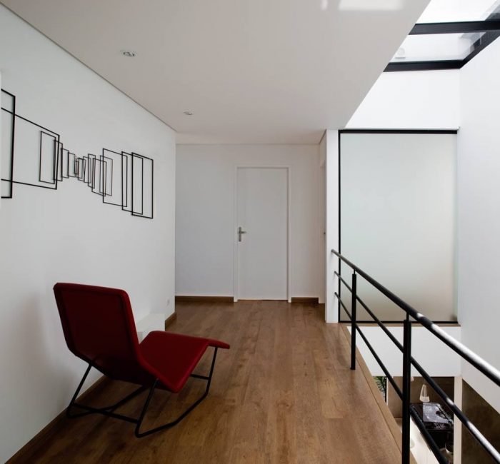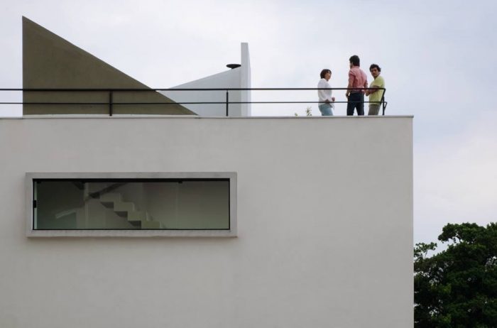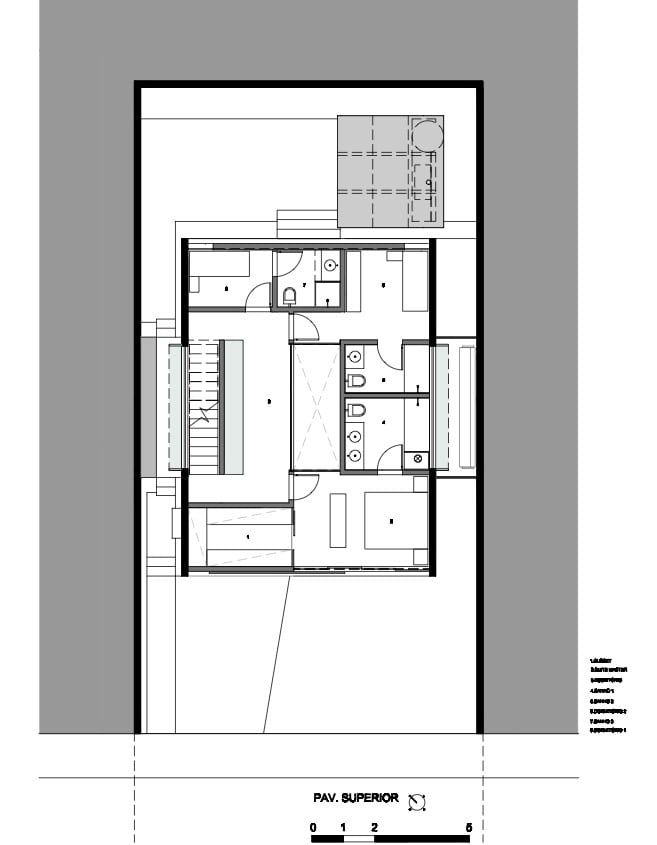 The house was designed by a succession of free horizontal slabs with strategic holes. In these 8x11 meters plans, these holes allow vertical circulation and the entry of zenith light. Natural light enters next to the water tank, passes through the upper floor and reach the social floor.