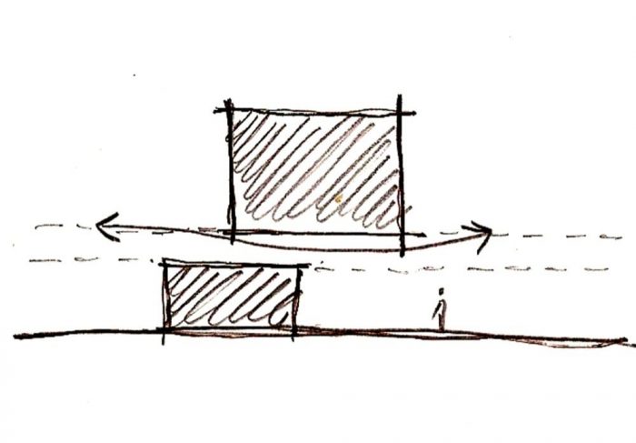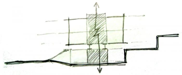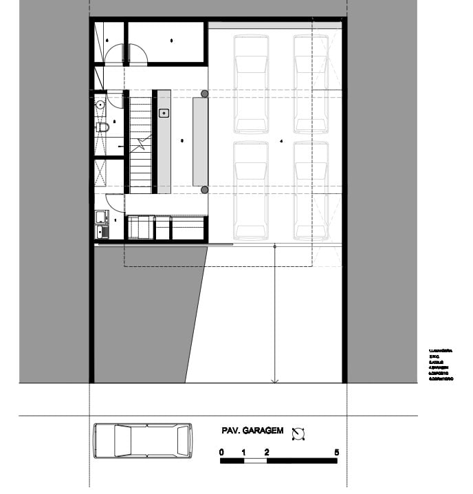 This transition provided by two metal beams allows the floor of the garage to spread to the maximum boundary of the site. Maximum occupancy without affecting ventilation and lighting guaranteed exactly by that range