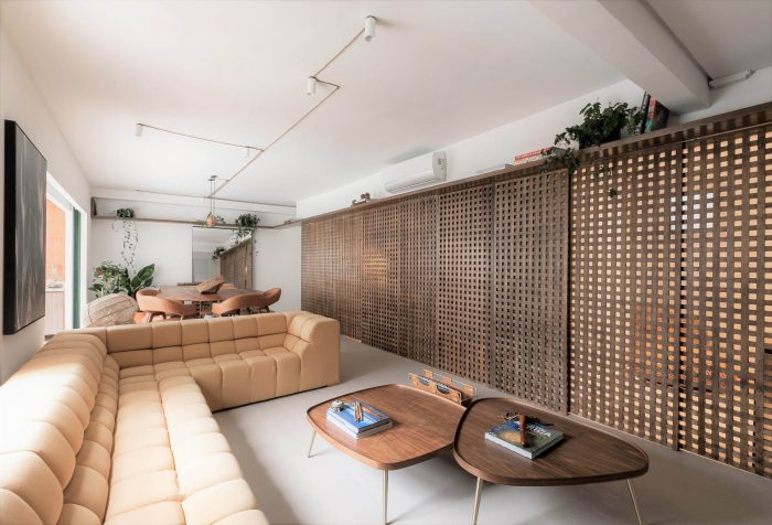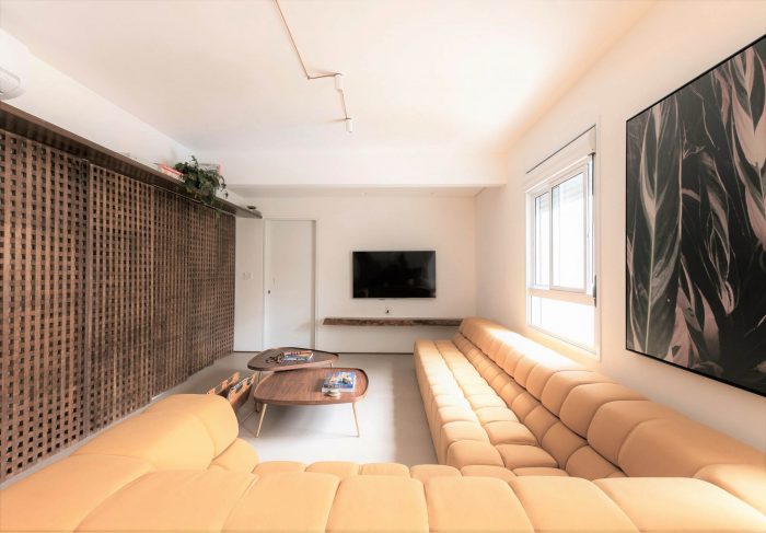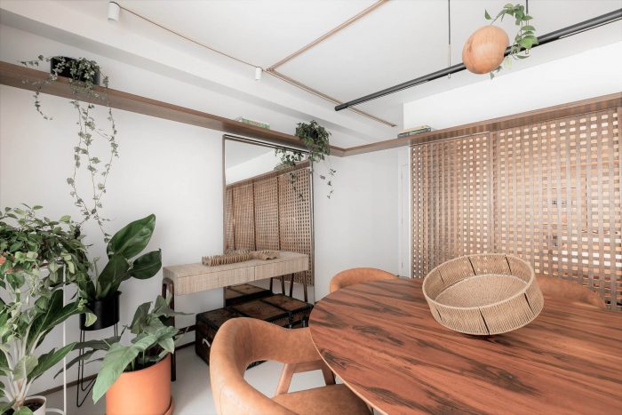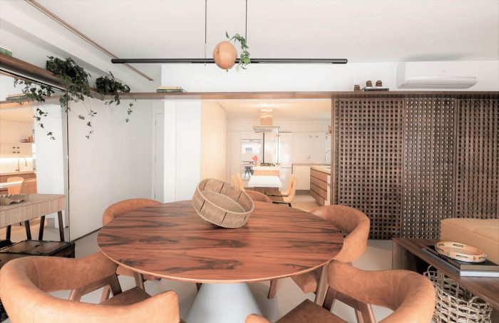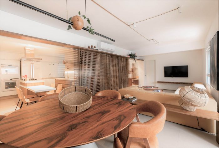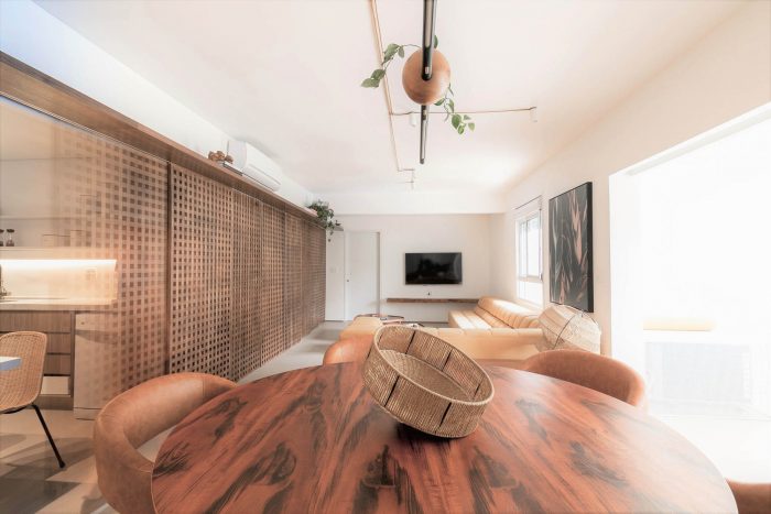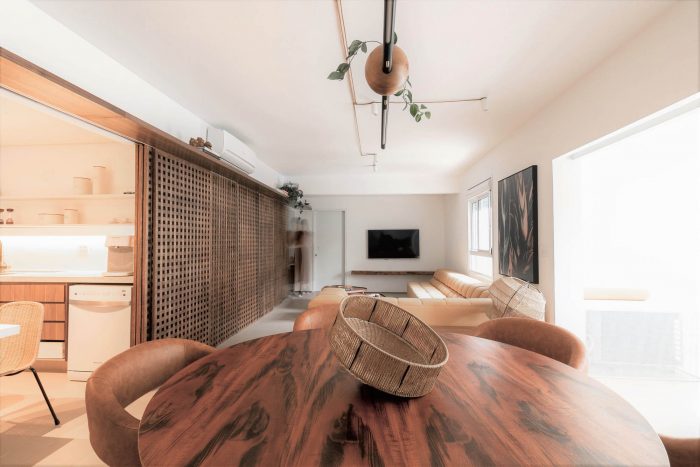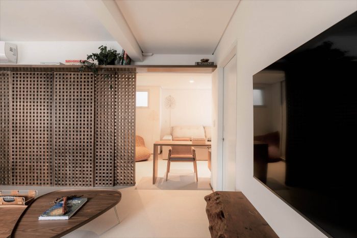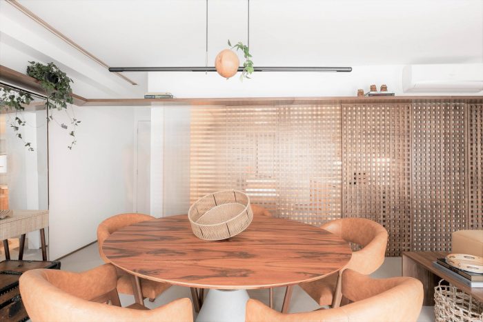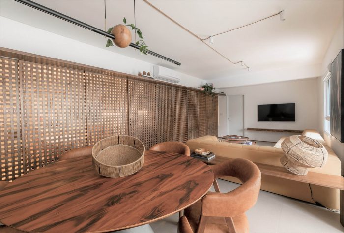 Muxarabi is the protagonist, art in Brazilian elements, materializes the possibility of handcrafted joinery, coexisting in the metropolis with all the innovation we have today in architecture and interiors. It is a functional background, which articulates the accesses and consolidates the versatility of the space.