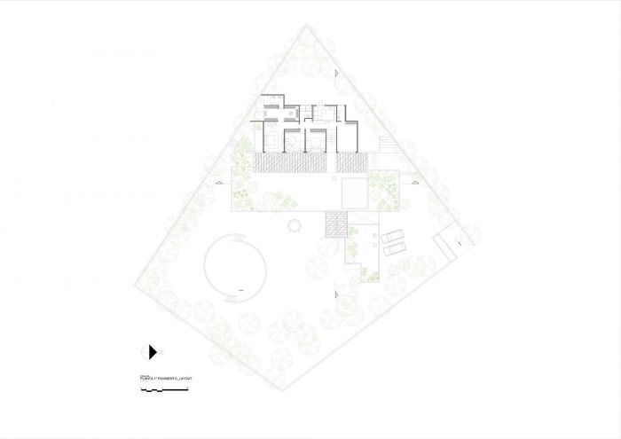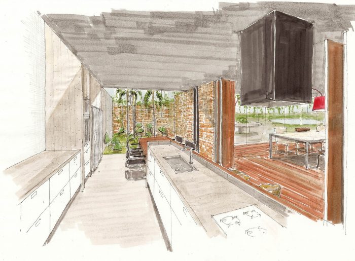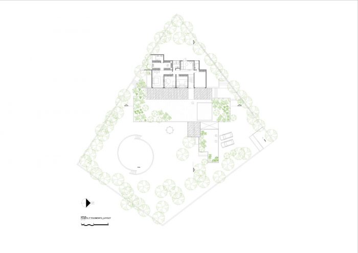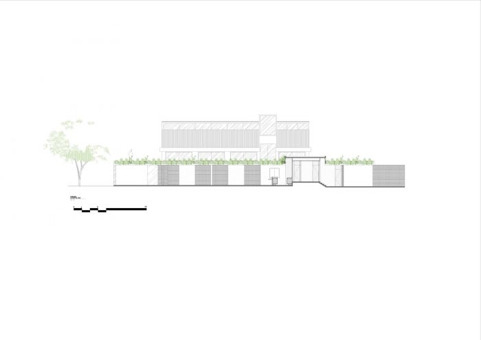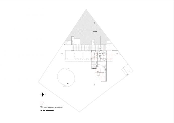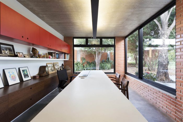 To meet the new request, it was necessary to swap the area of the whole service quarters with the social accesses. The kitchen was relocated to where the foyer used to be, thus communicating with the lounge and the dining room. The covered parking was created from the demolition of the former laundry room. The home offices were built adjacently to the house gardens, where the steam room and shed used to be.