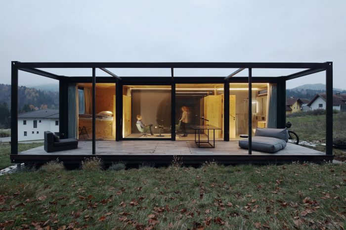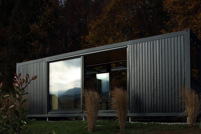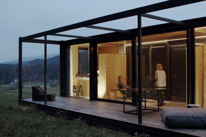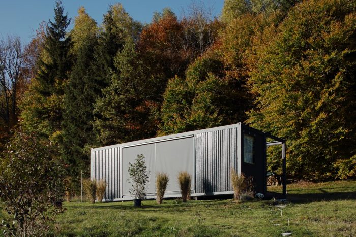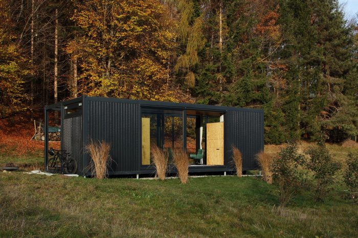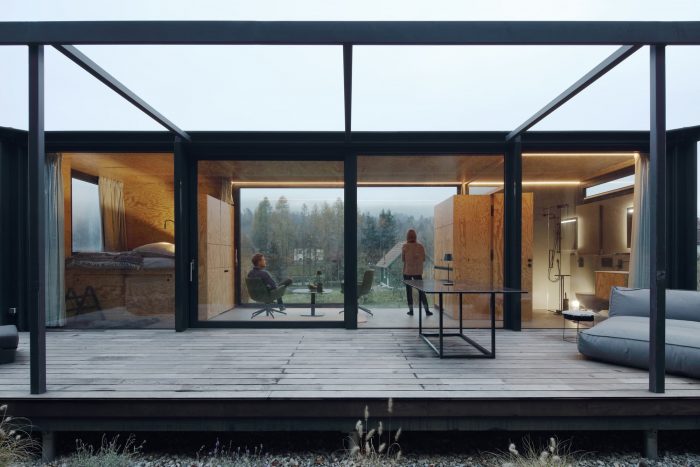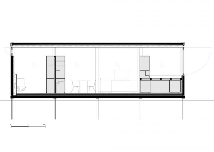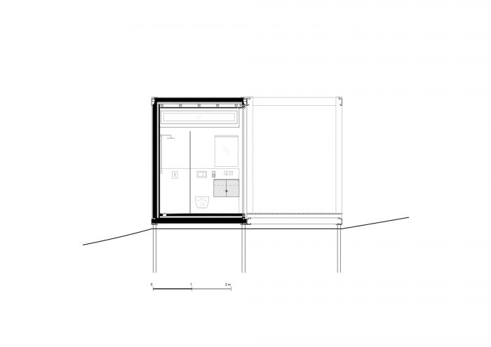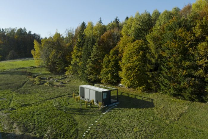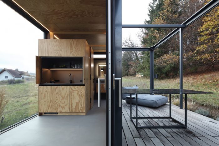 The compact space is divided into 4 equally sized areas: bedroom, living /workspace, kitchen, and bathroom. Despite the spatial constraints bathroom and kitchen are fully equipped and include modern conveniences such as a dishwasher and a washing machine. To make the most of the space available a desk including a foldaway screen can be pulled out from underneath the bed. The living module is complemented by a terrace module of equal size facing a beautiful treeline to the north.